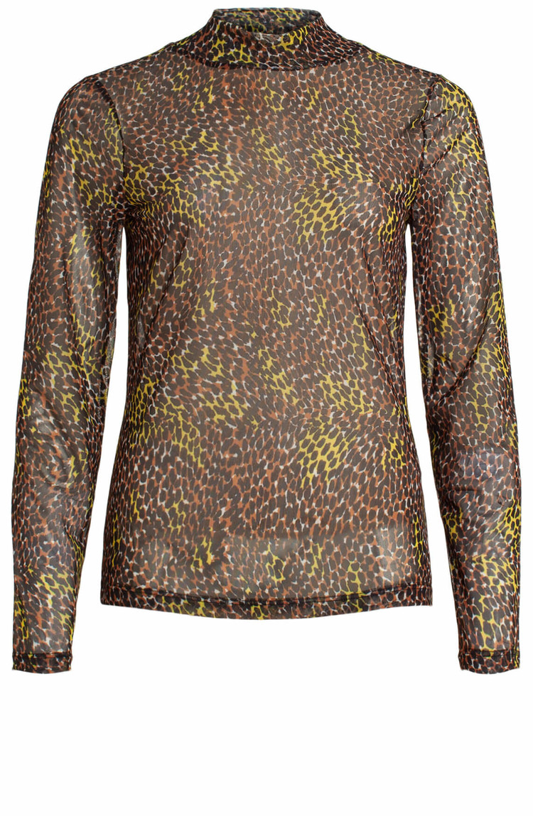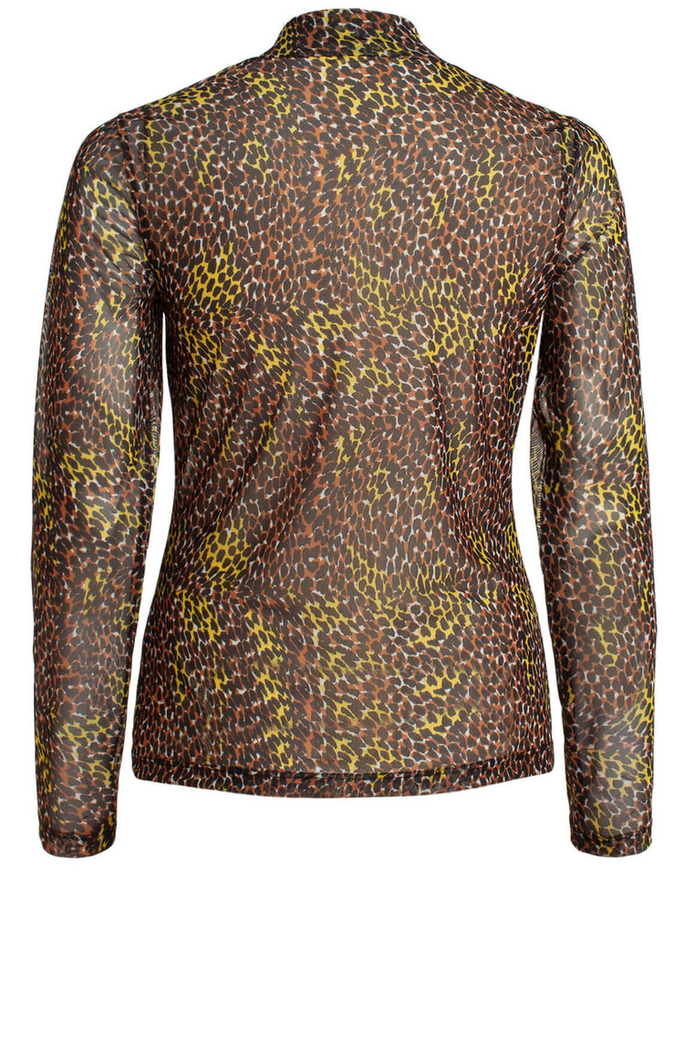 • Mesh shirt van het merk Anna in de kleuren camel, geel en zwart. Het shirt heeft een hoge kraag en is transparant. Wij raden je aan een top onder dit shirt te dragen.