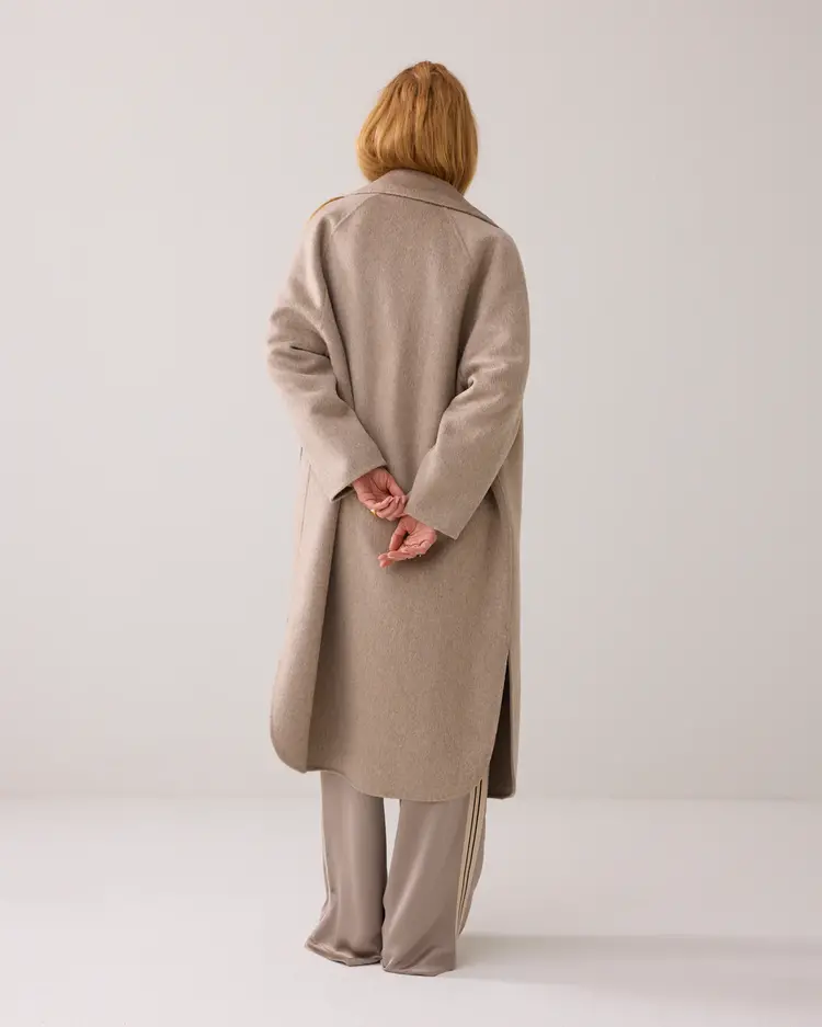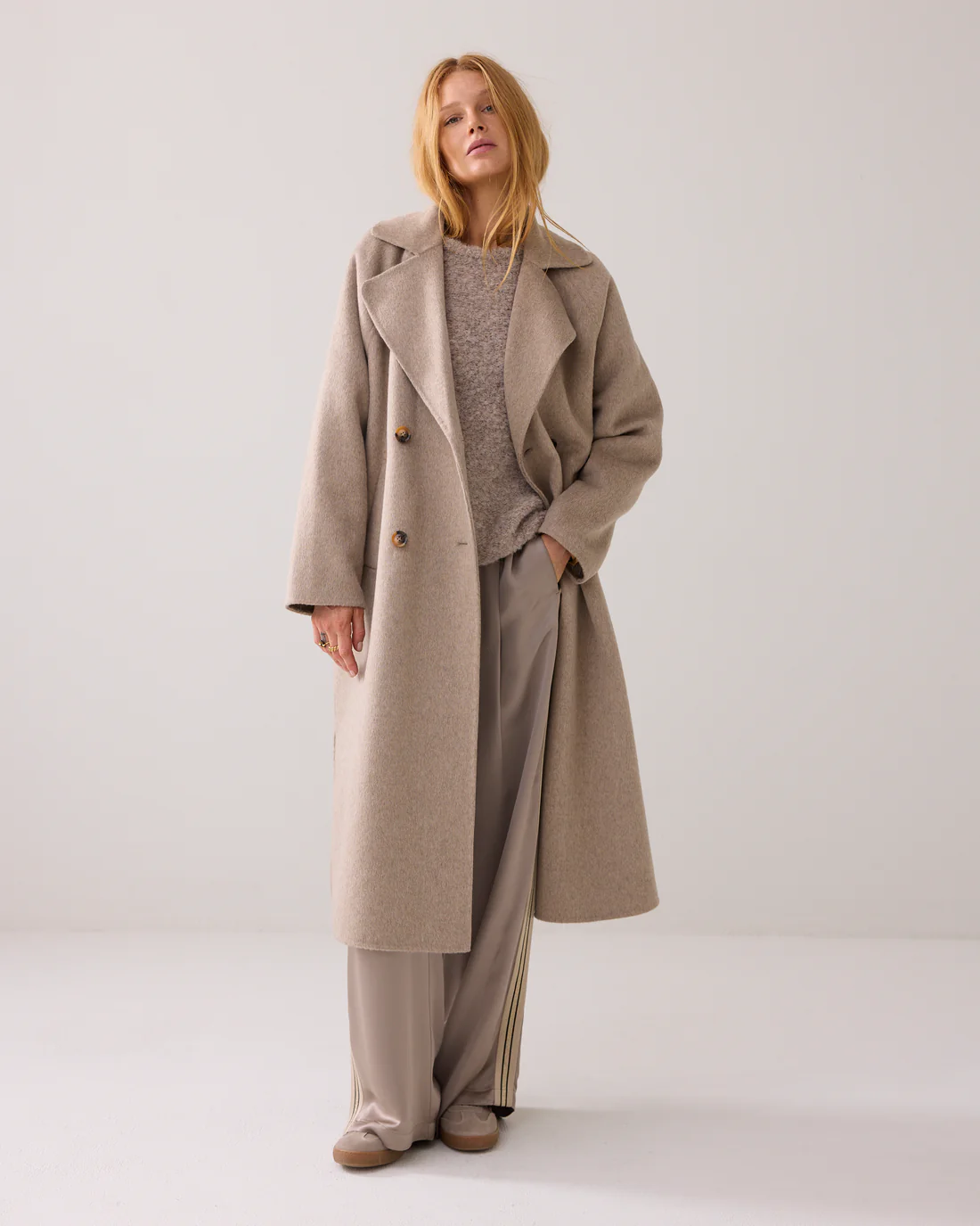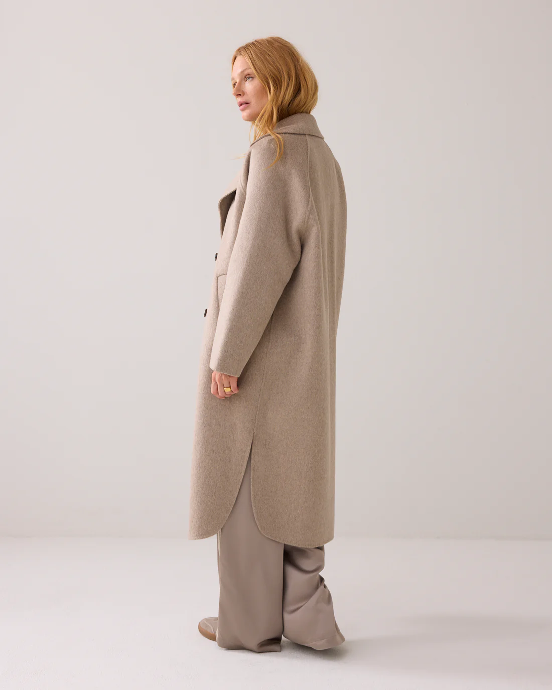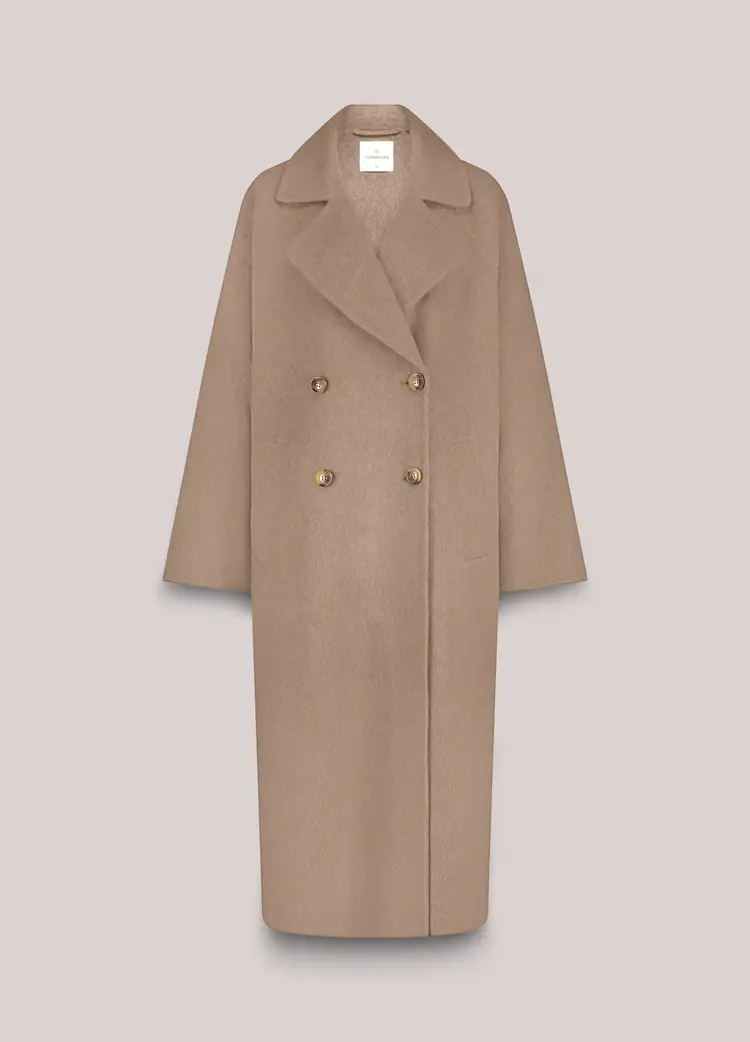 • Deze oversized double breasted mantel van het merk Summum is gemaakt van een waxy wolblend en is daarom heerlijk warm. De jas heeft afgeronde revers en splitten.
