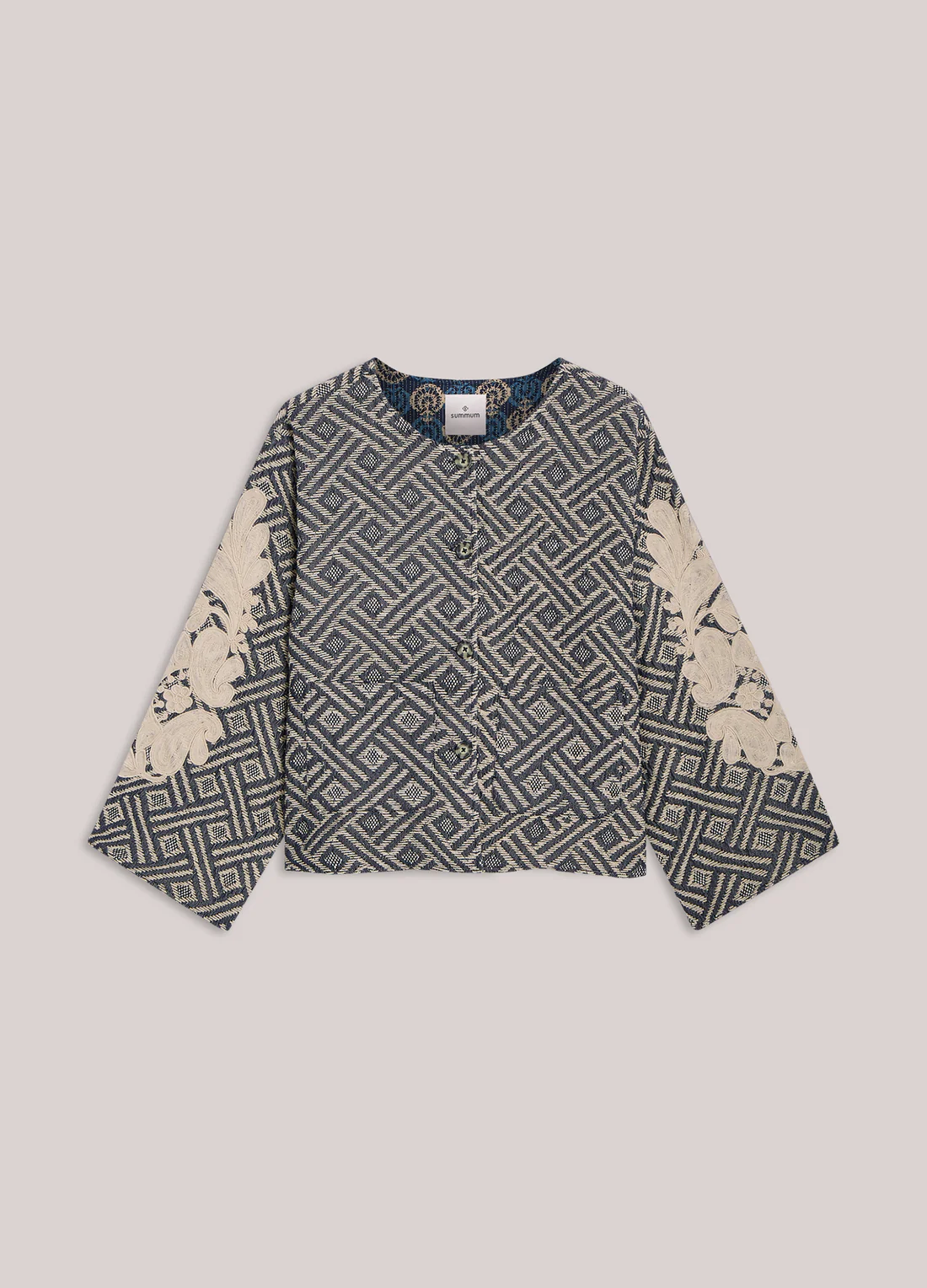 • Ruimvallend reversible jasje van het merk Summum met een rijke jacquard aan de ene kant en een blockprint aan de andere. Het jasje heeft opgestikte zakken, kleine zijsplitten en is afgewerkt met fijn borduurwerk op de mouwen en achterkant.
