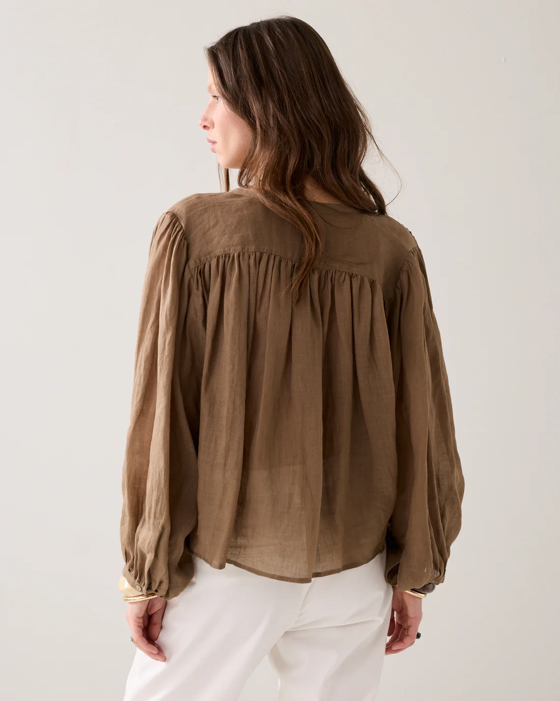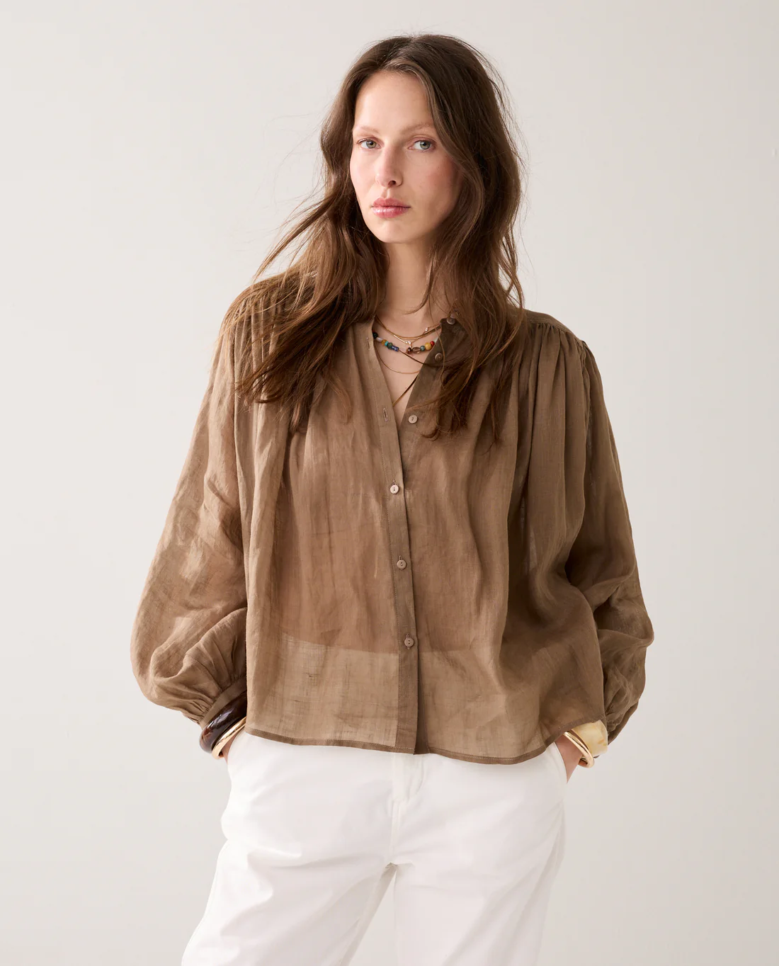 • Blouse van het merk Summum met een korte, wijde pasvorm in linnenlook (Ramie). De blouse heeft een gerimpelde pas, lange ballonmouwen en ton-sur-ton knoopjes.