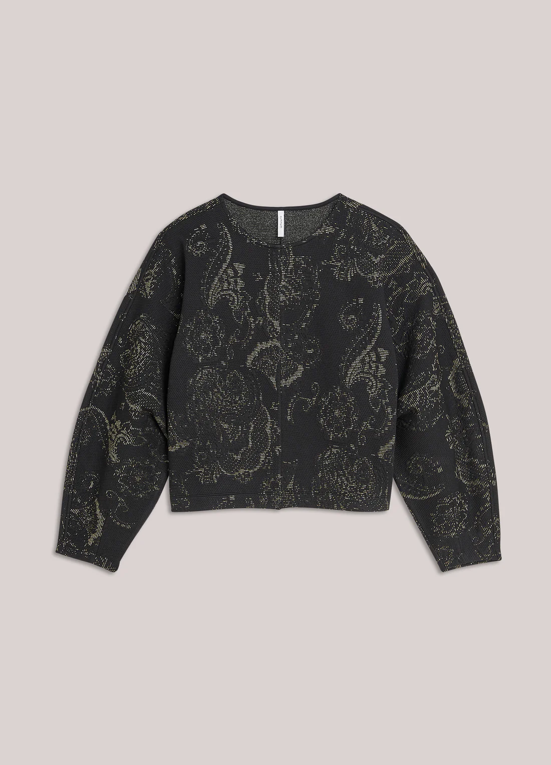 • Feestelijke top van het merk Summum, gemaakt van stevige foam jersey met ingeweven ornamenten in een subtiele glitter. De trui heeft een cropped boxy fit, ronde hals en aangeknipte ballonmouwen met een naad en plooien voor extra volume.
