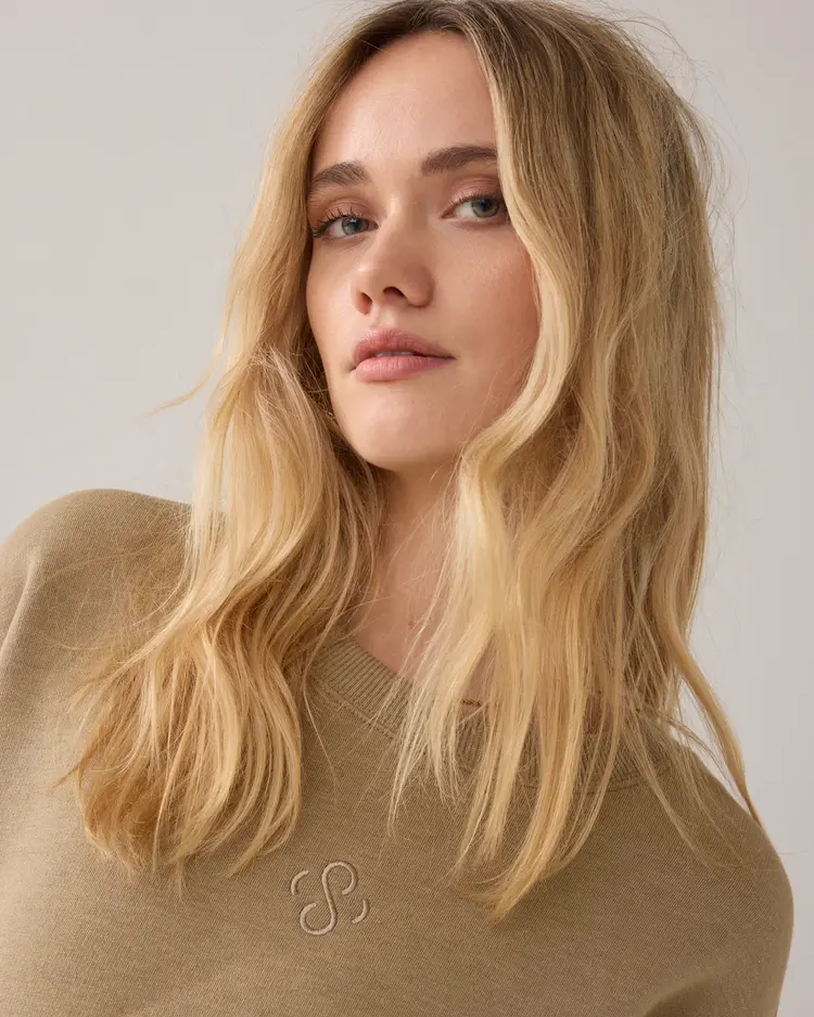 • Sweater van het merk Summum in een boxy fit met korte mouw en verlaagde schoudernaad, uitgevoerd in een zachte melangekleur. De korte mouwen hebben een vaste omslag. Het Summum-logo staat klein en tonaal middenvoor.