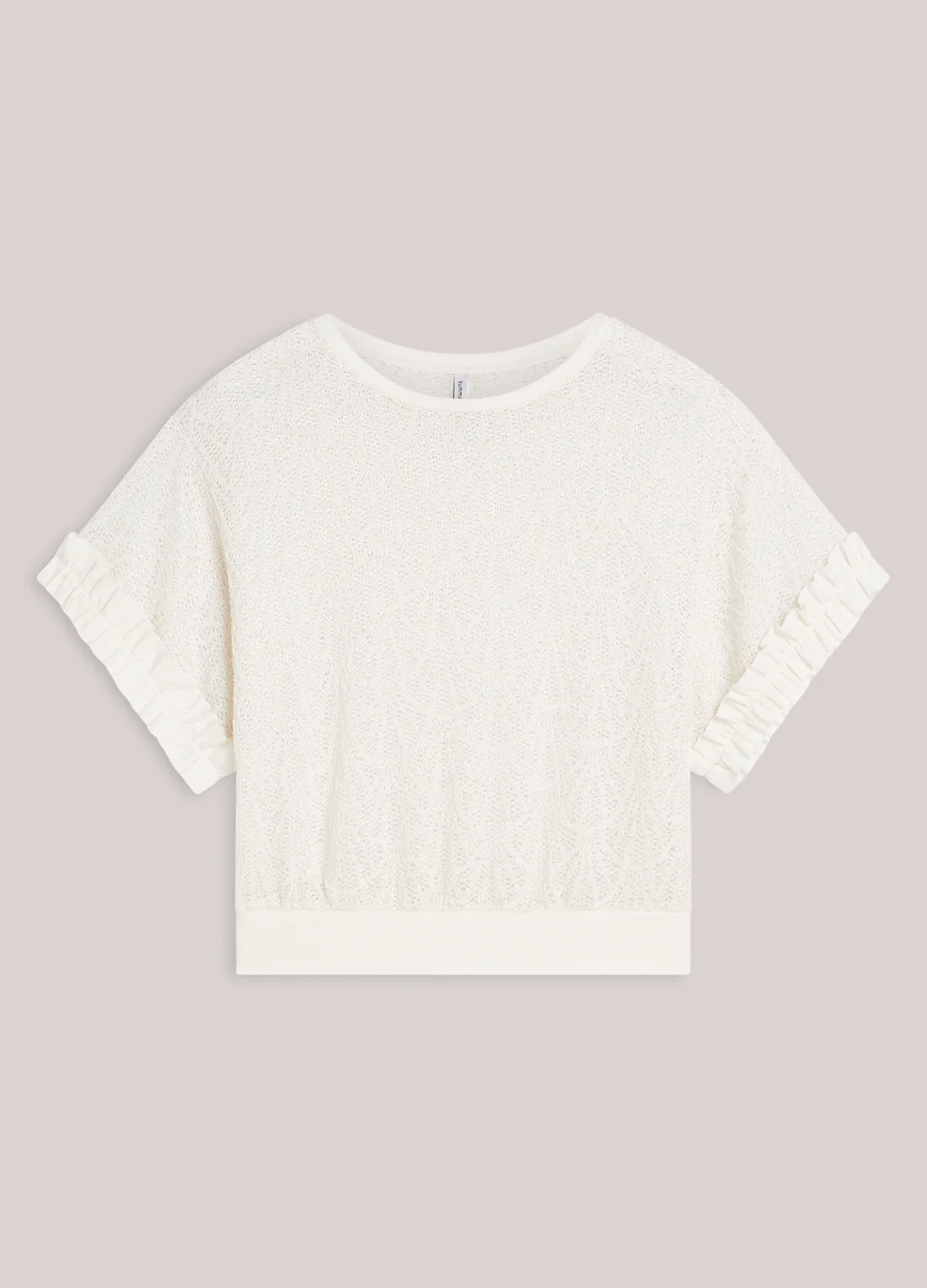 • Boxy top van het merk Summum, gemaakt van een transparante, kantachtige stof met een ronde, wijde hals. De top heeft korte wijde kimonomouwtjes en ruffles langs de mouwranden.