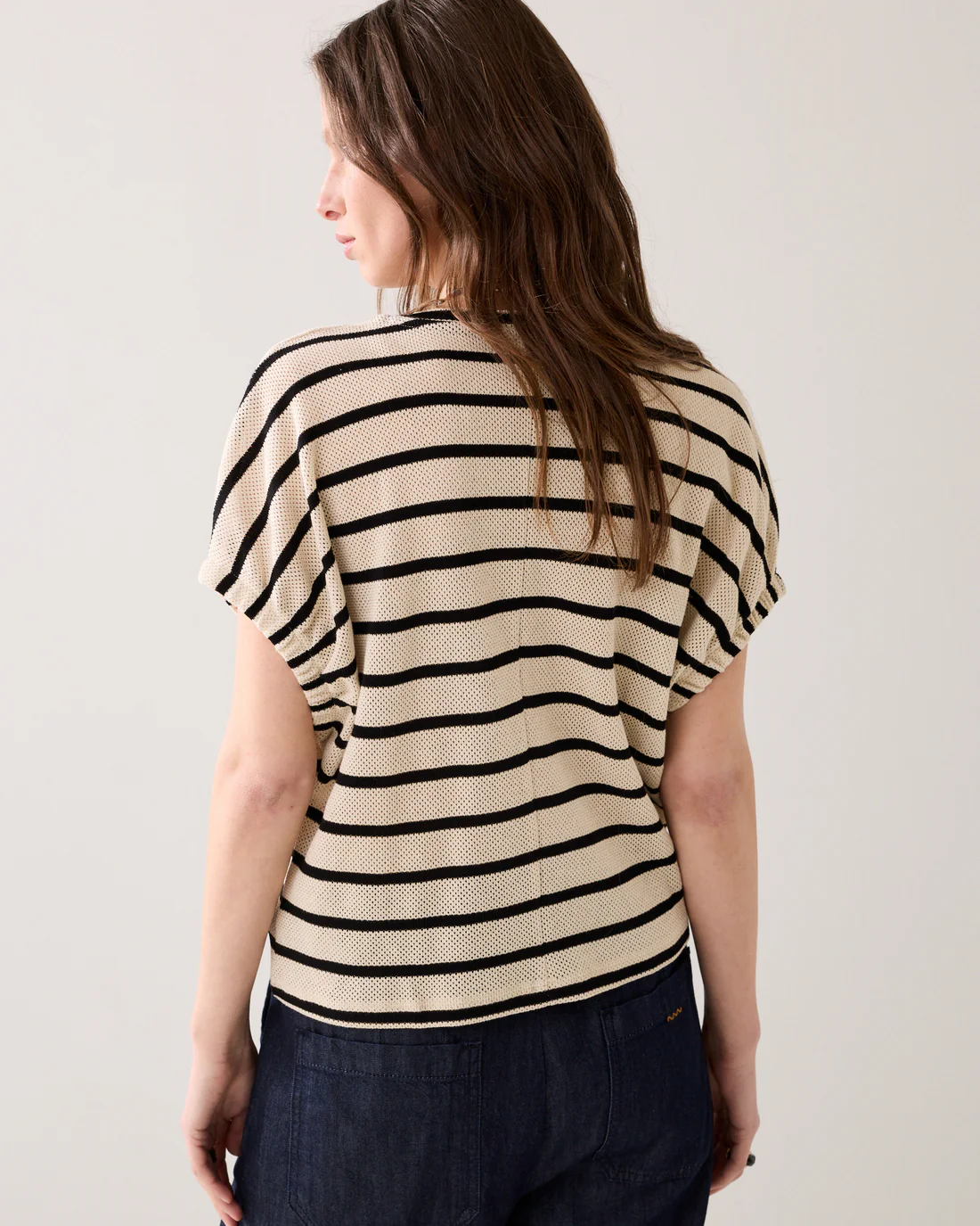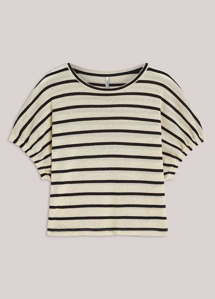 • Boxy mesh top van het merk Summum met een yarn-dyed streep en ingeweven lurexdraadje. De top heeft korte aangeknipte mouwen met elastische boordjes en een ronde, hoge hals die wijder valt.