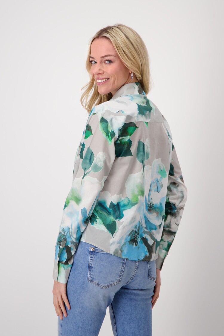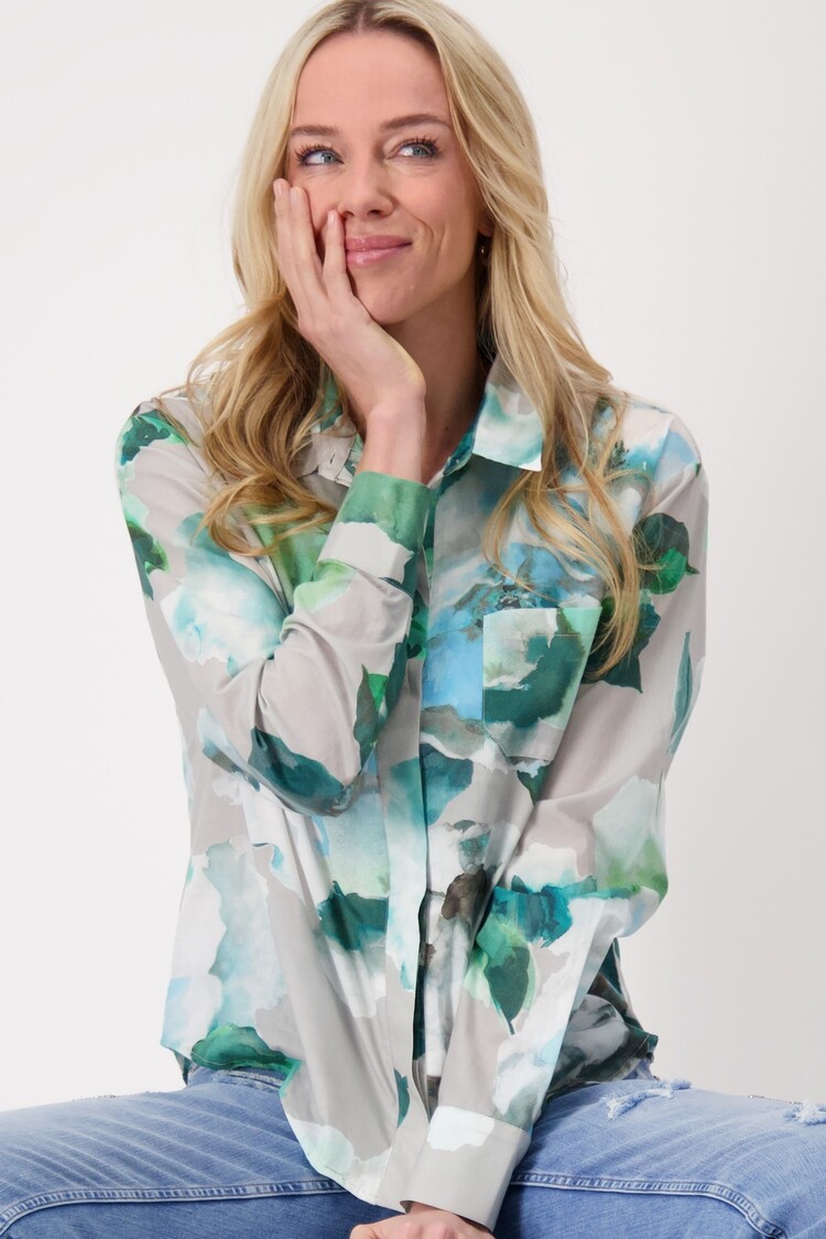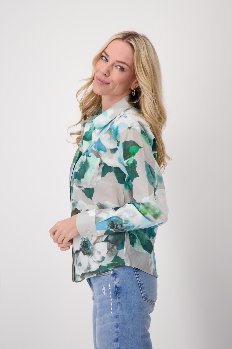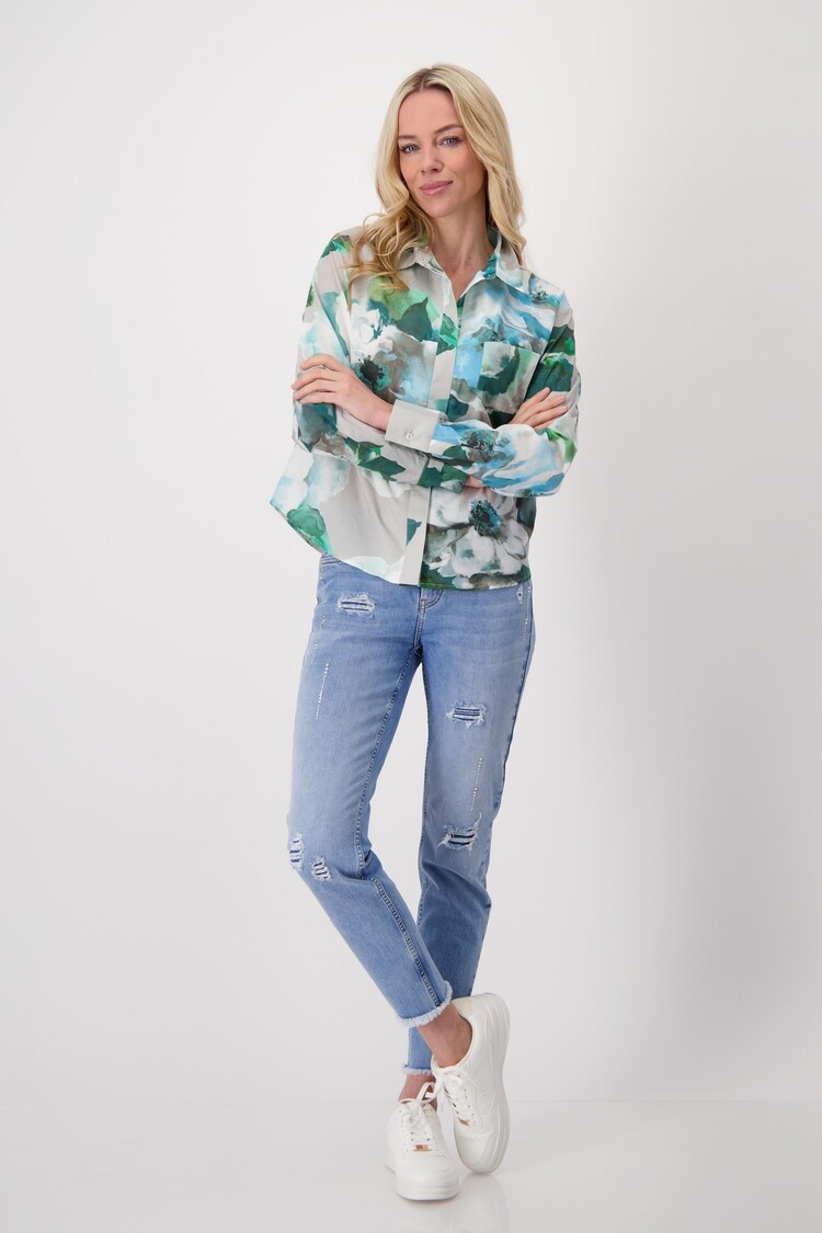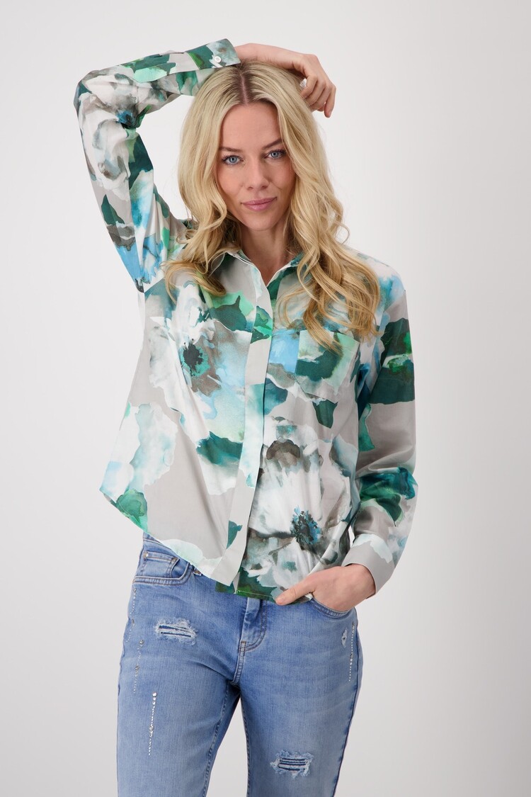• Trendy overhemdblouse van het merk Monari met bloemenprint, langwerpige voorkant en afgeronde zoom.