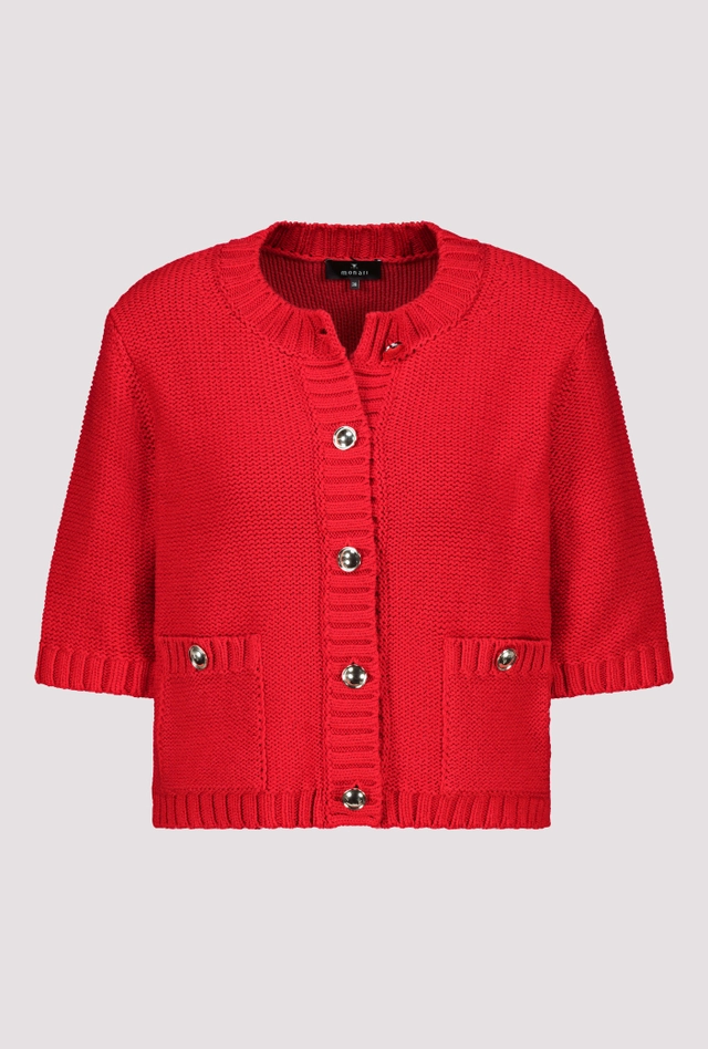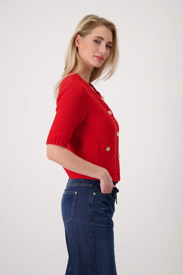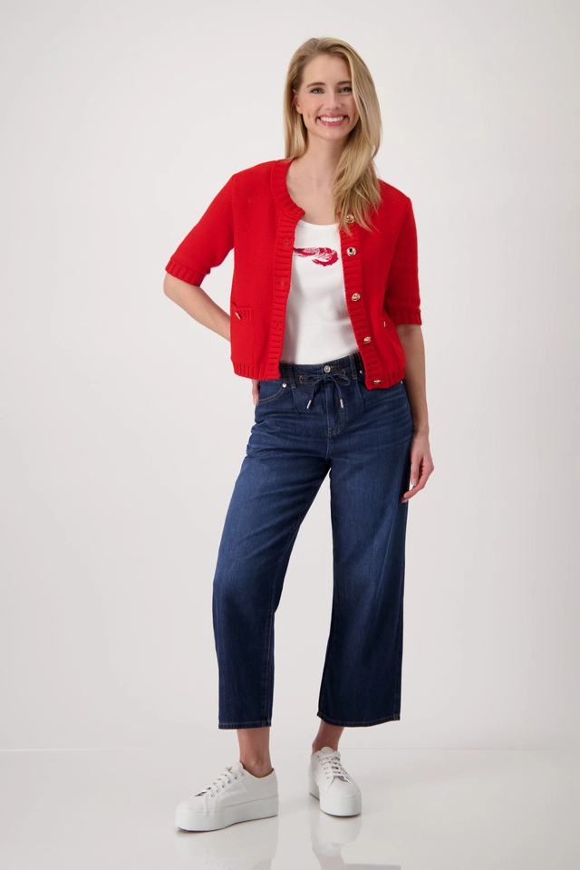 • Dit vest van het merk Monari met knoopsluiting, gemaakt van een hoogwaardige katoenmix, maakt indruk met zijn geribde ronde halslijn, geribde knopenlijst en opgestikte zakken.