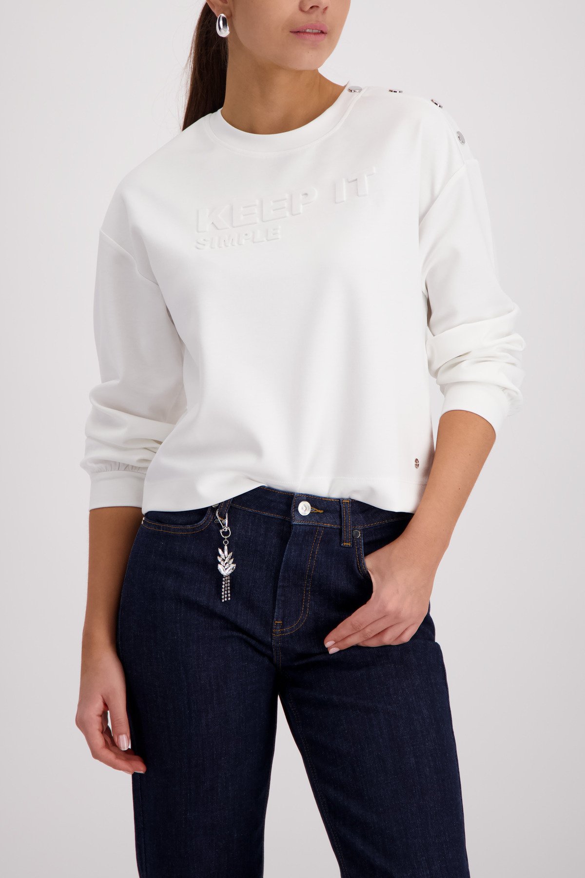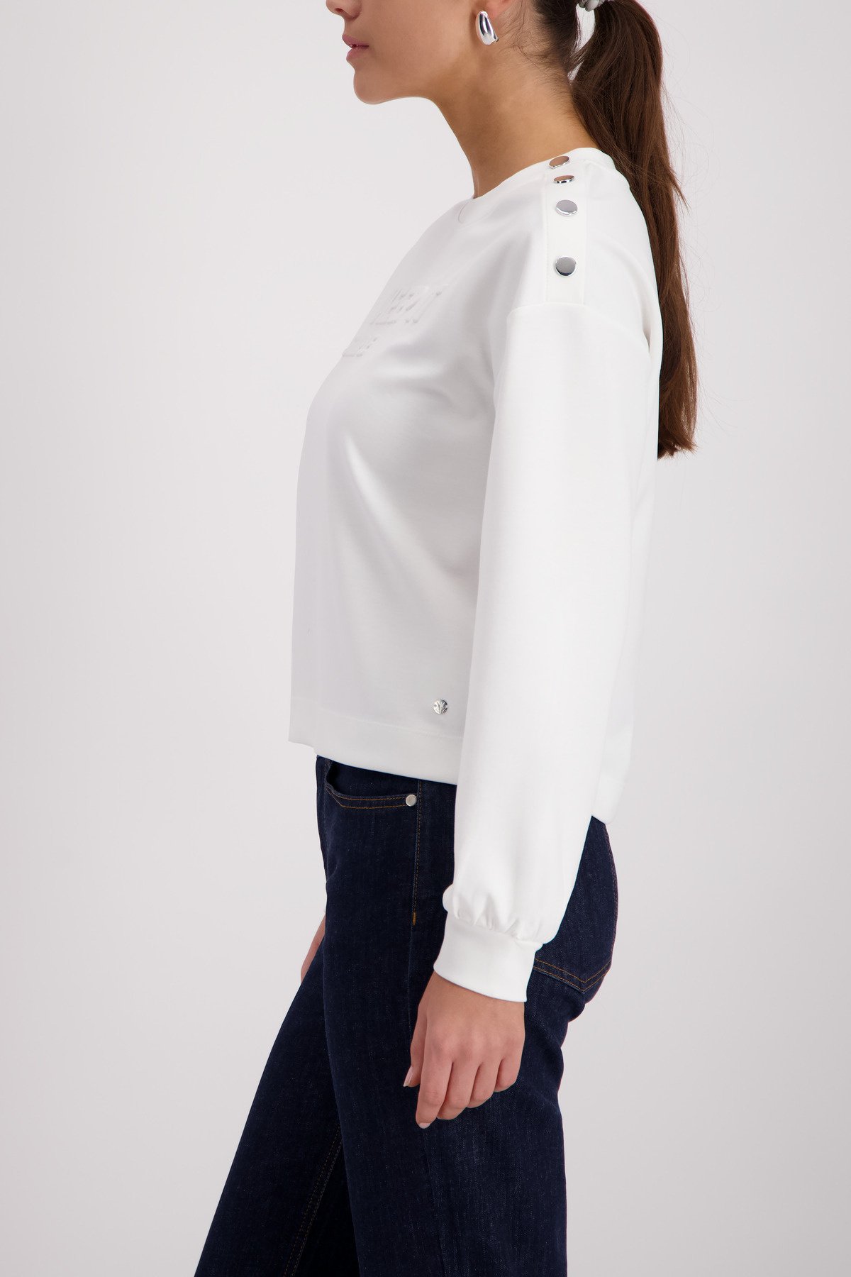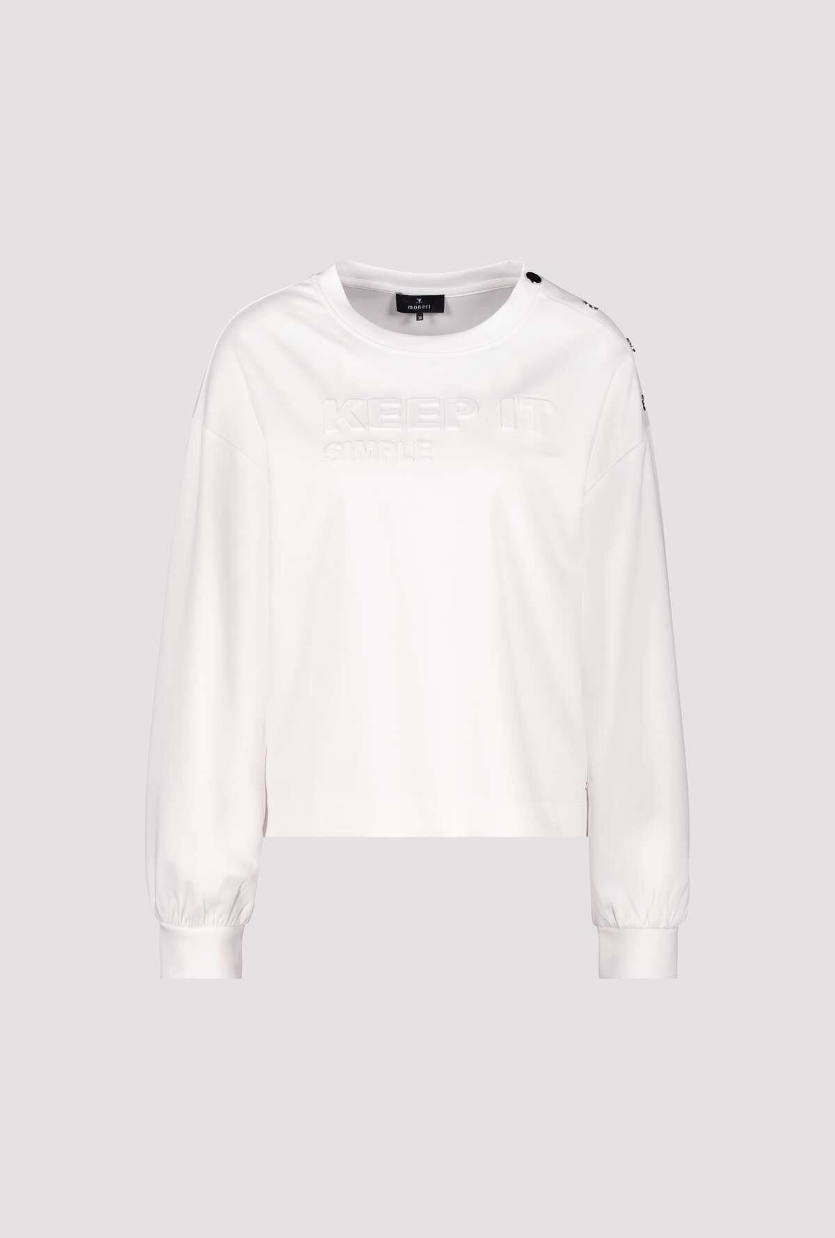 • Dit stijlvolle sweatshirt van het merk Monari combineert soepelvallende viscose met een reliëfopdruk en een knoopsluiting op de schouder.