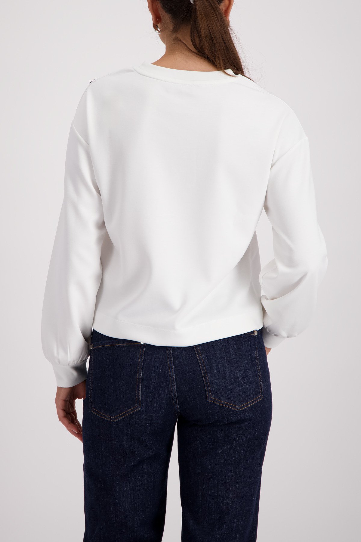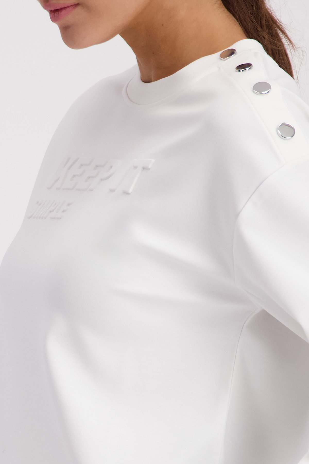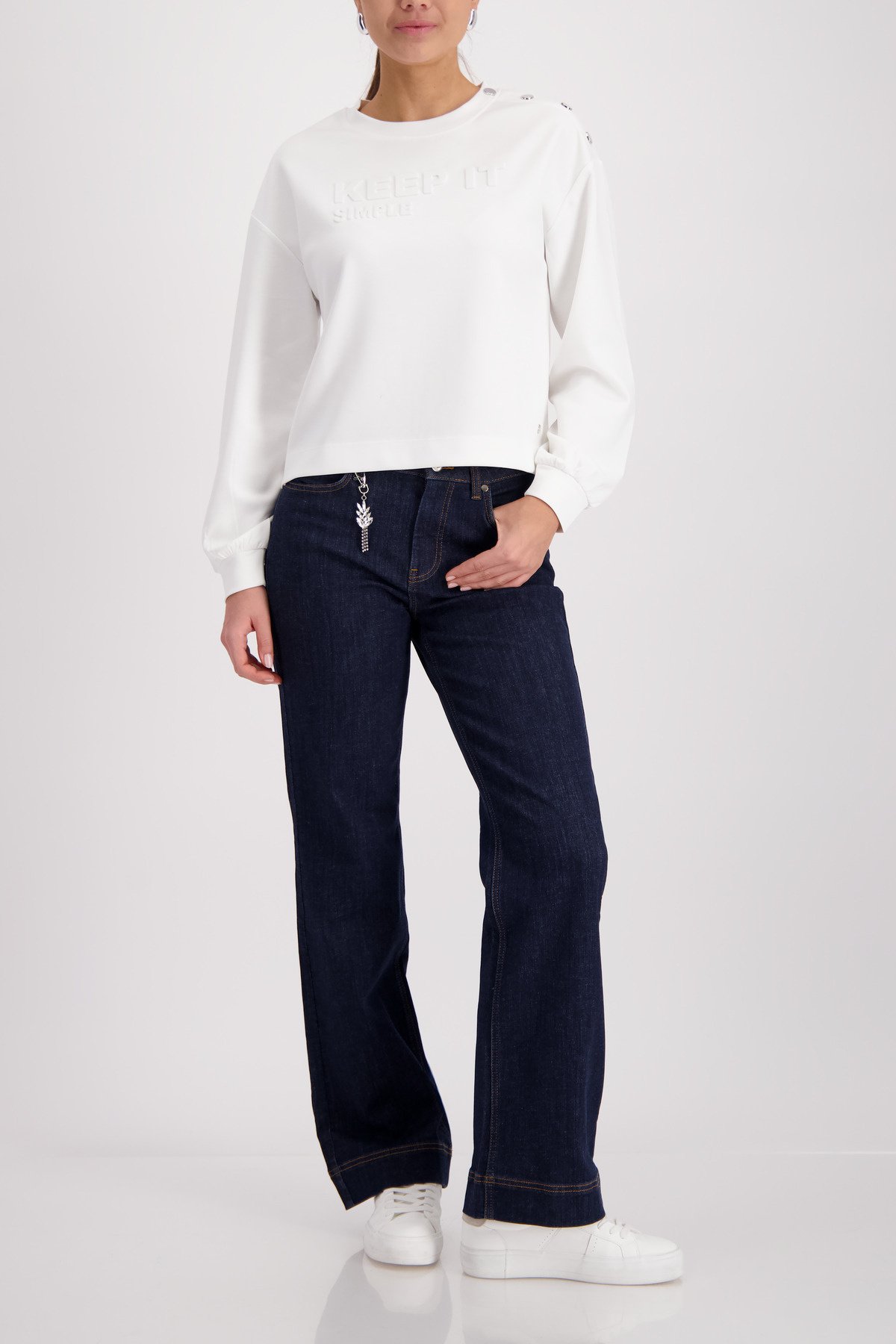 • Dit stijlvolle sweatshirt van het merk Monari combineert soepelvallende viscose met een reliëfopdruk en een knoopsluiting op de schouder.