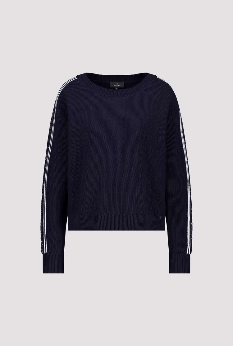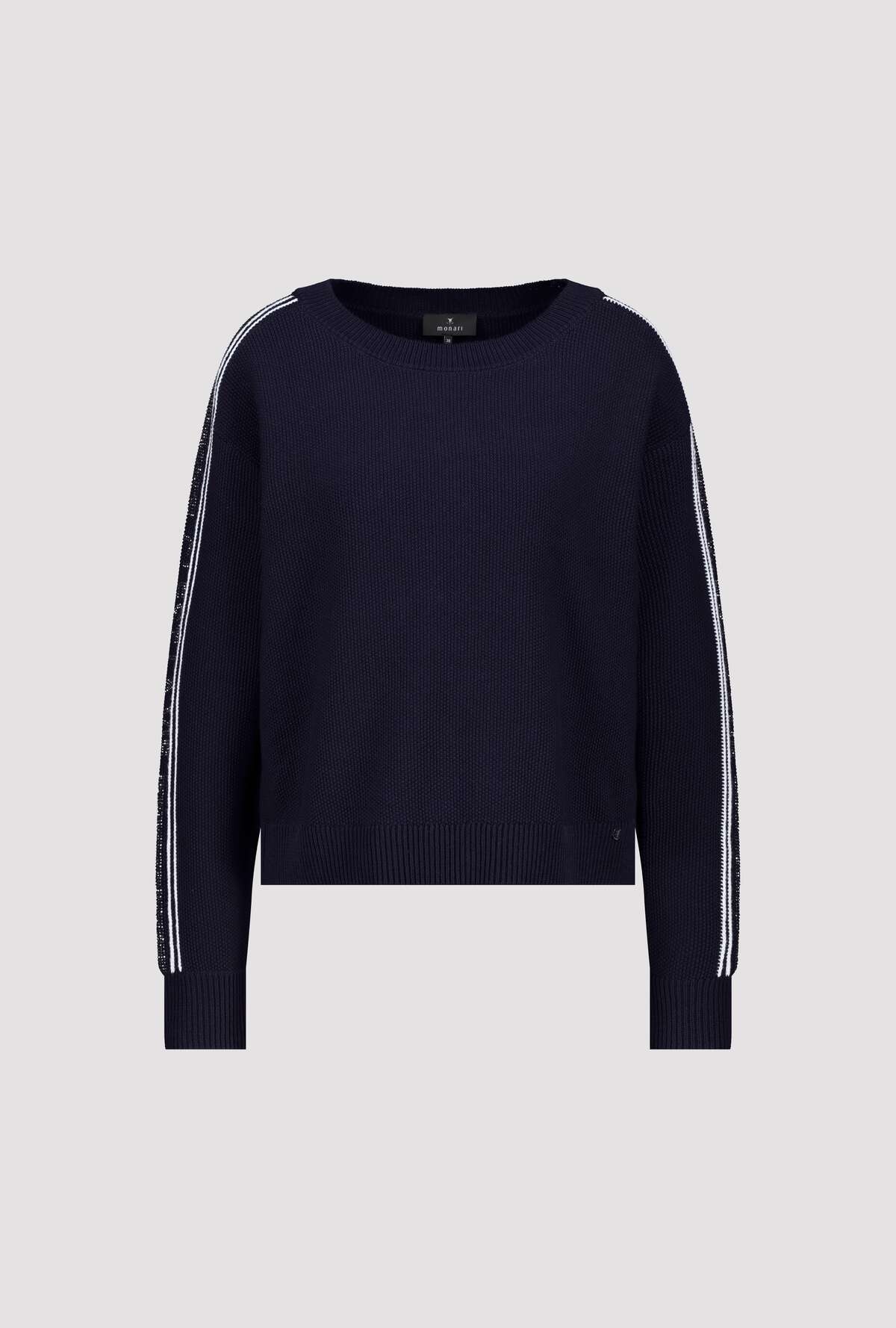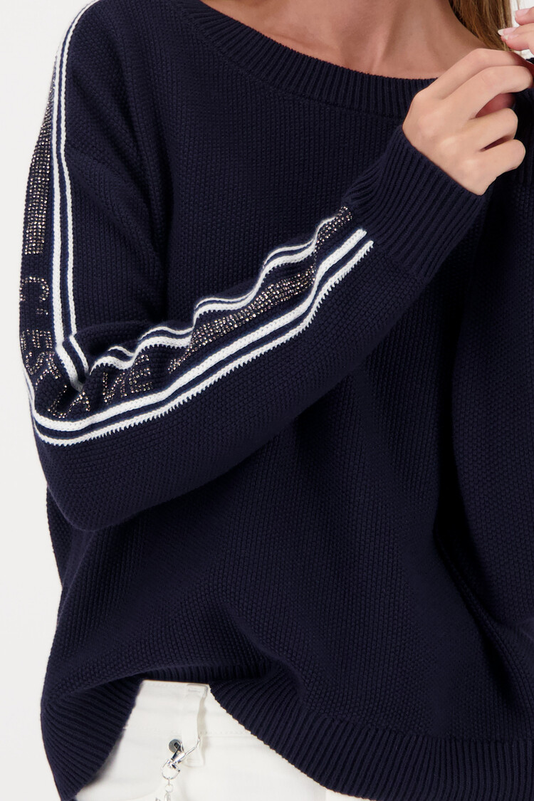 • Elegante gebreide trui van het merk Monari, gemaakt van 100% katoen met korrelige structuur, streepjesdetails en sprankelende strass-letters voor stijlvolle accenten.