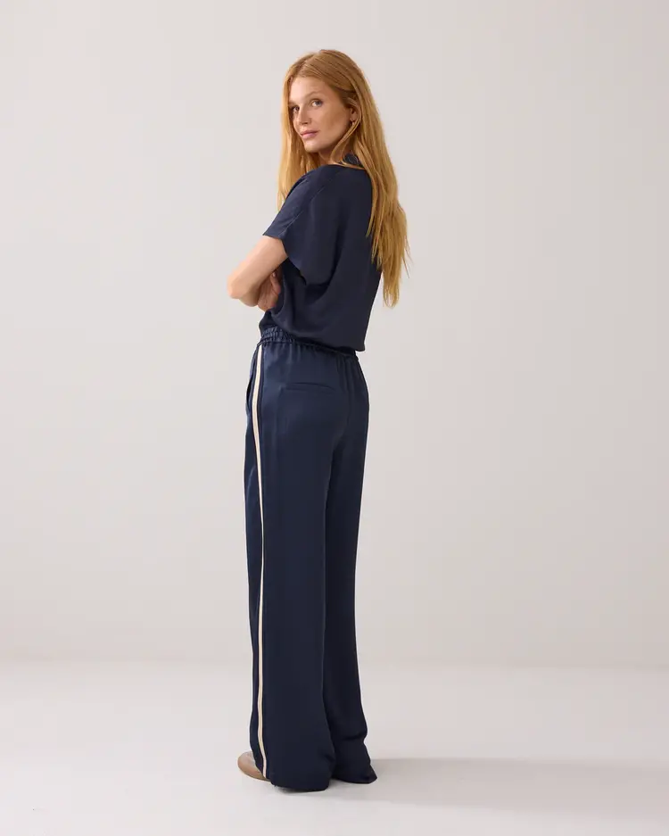 • Deze soepelvallende broek van het merk Summum is uitgevoerd in een glanzende, iets zwaardere stof met een comfortabele elastische tailleband en speelse contrastbies langs de zijnaad. De broek heeft rechte steekzakken naast de bies en een fake gulp.