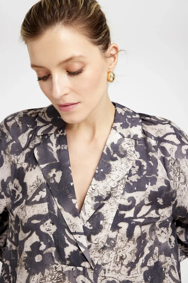 Deze blouse van het merk Gustav is gemaakt van:Materiaal 1: 60% Cupro, Sand w. Chanterelle Print;Materiaal 2: 40% Viscose.