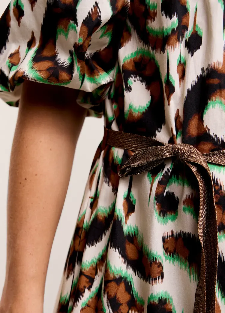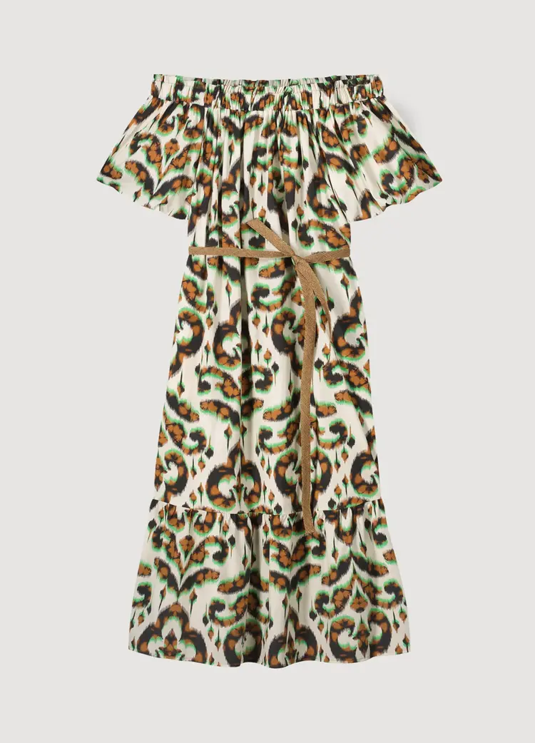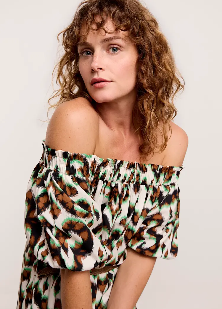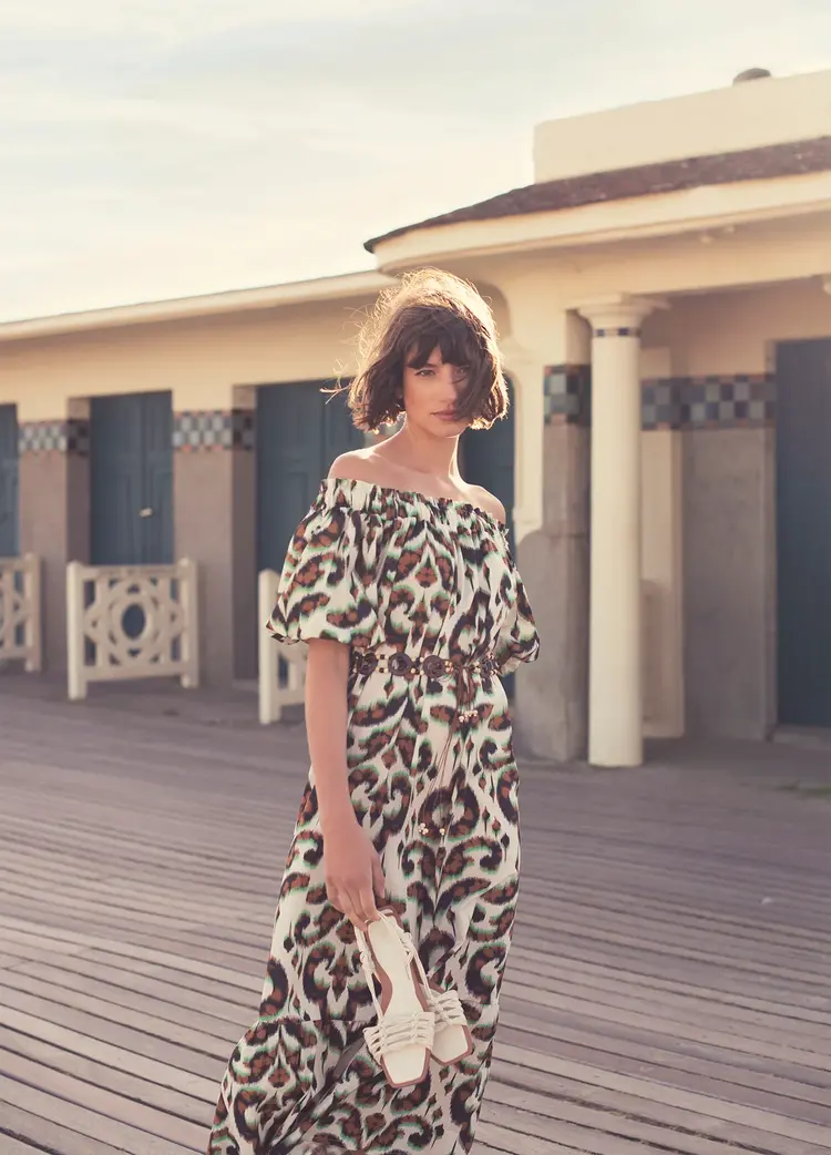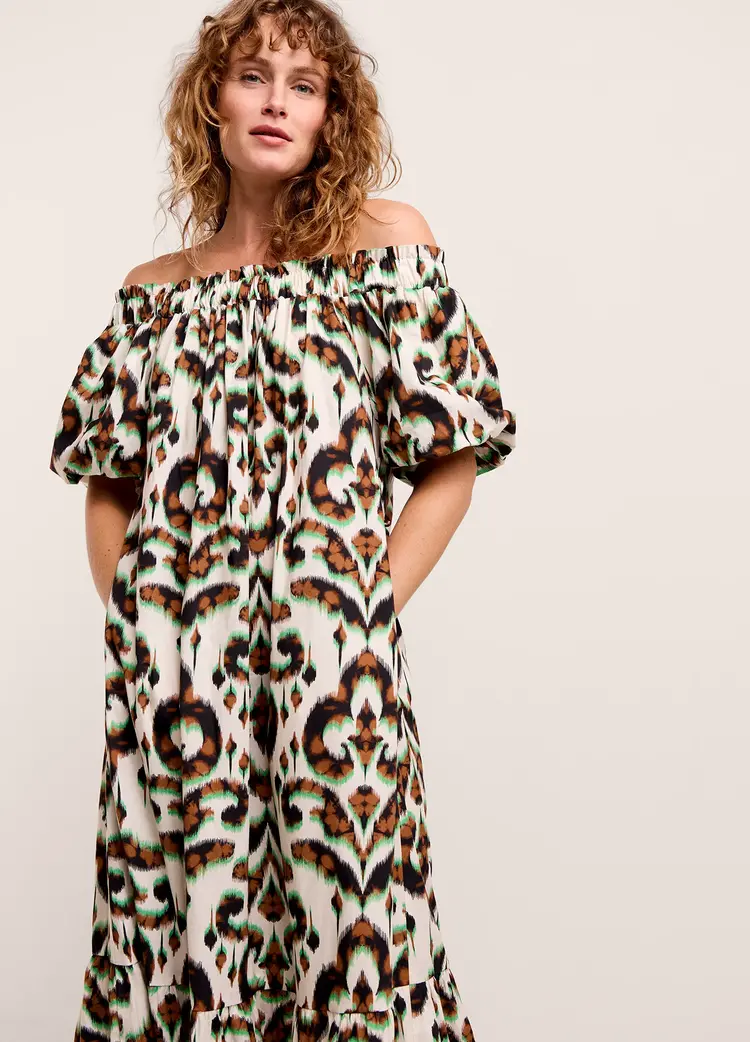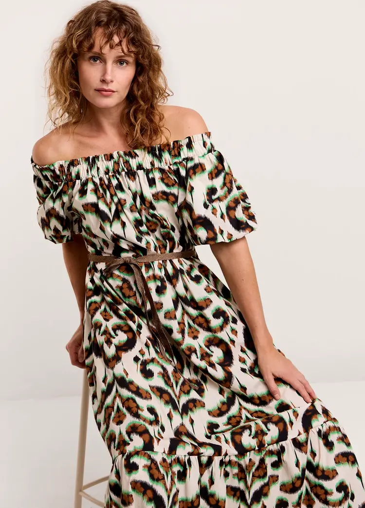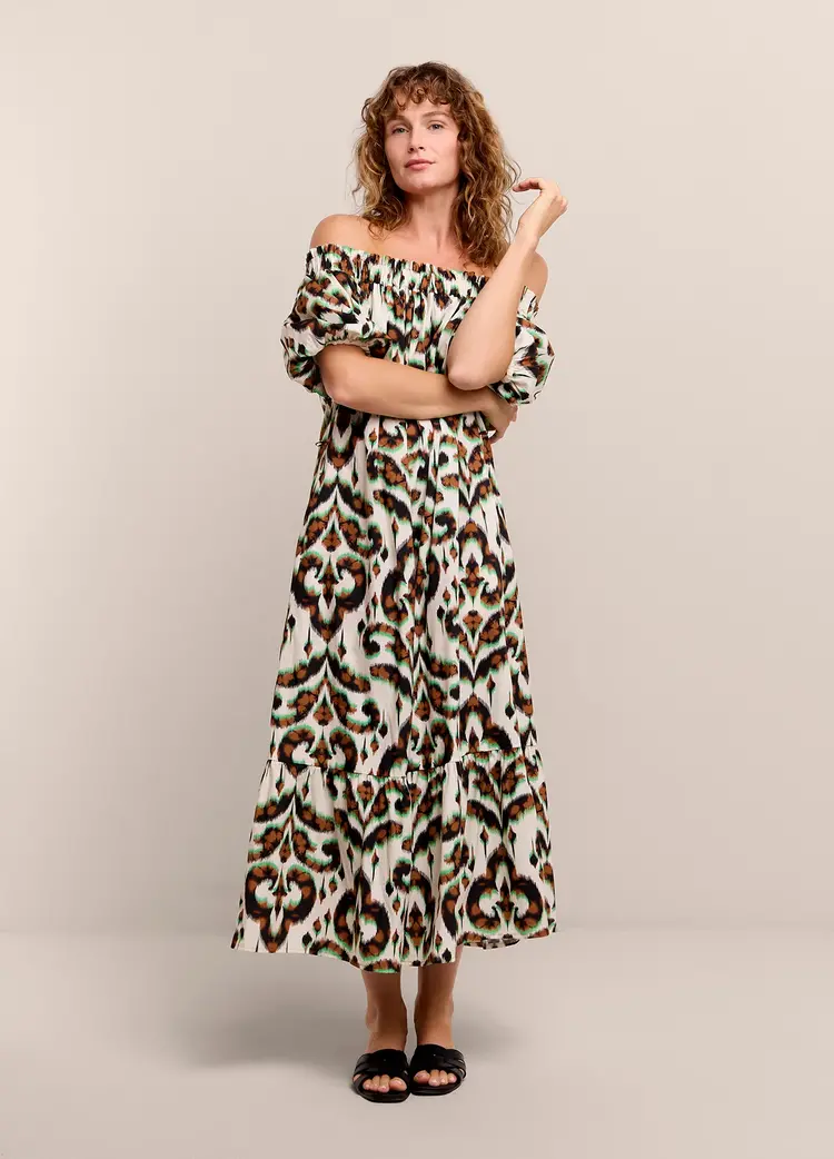 • Lange jurk van het merk Summum met korte pofmouwtjes, die door de gesmokte halslijn off-shoulder én op de schouder draagbaar is. De jurk heeft een overall ornamentenprint en een taillekoord.