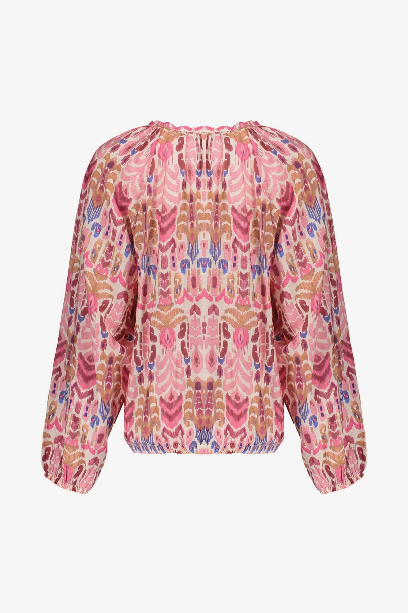 • Deze Geisha top is een speelse mix van zachte pastel strepen en gedrukte embroidery in frisse neonaccenten. De ronde hals met strikkoord en opvallende kwastjes geeft een vrolijke touch, terwijl sierknopen en elastische cuffs zorgen voor een subtiel detail