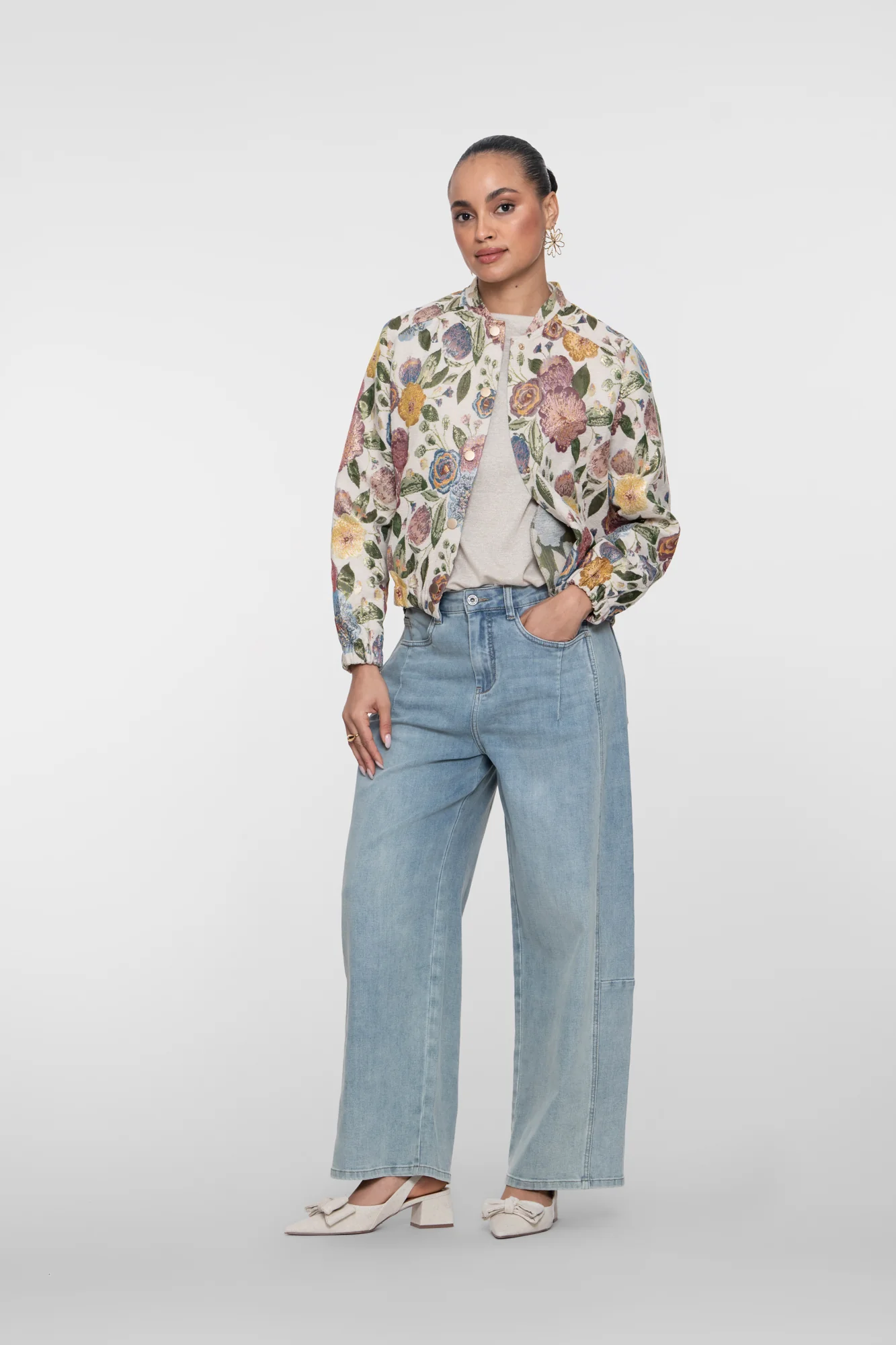• Dit Geisha Bloemenjacquard bomberjack met korte valling is een stijlvol, kort vallend bomberjack met een rijk jacquard bloemenpatroon. De geweven stof geeft diepte en luxe, terwijl de ronde boord hals en drukknopen zorgen voor een moderne uitstraling.