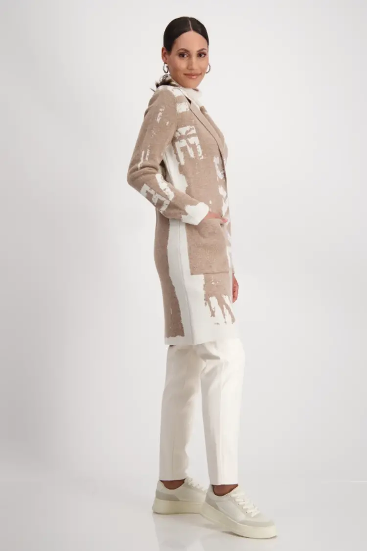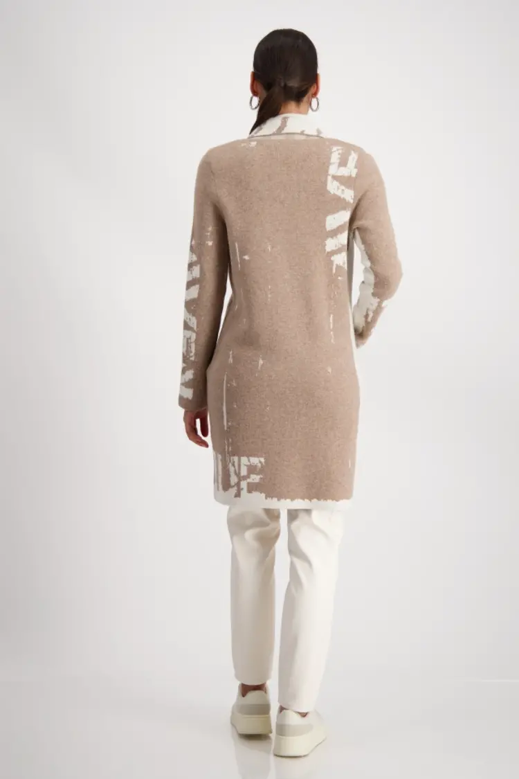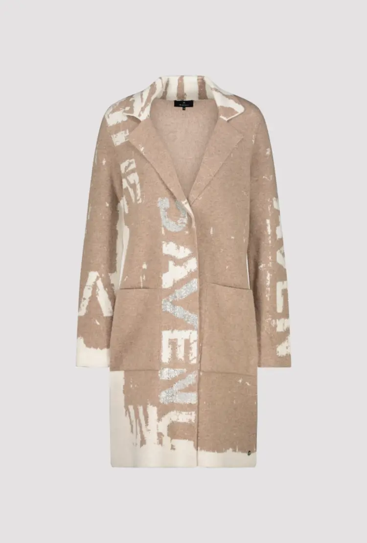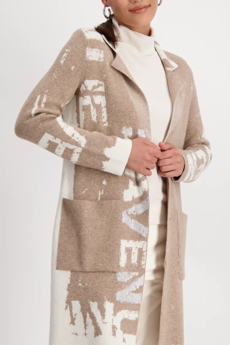 • Dit warme gebreid vest van het merk Monari valt op door de opvallende jacquardstof en fonkelende strass-letters. Met een klassieke reverskraag, blinde knoopsluiting en praktische opgestikte zakken.