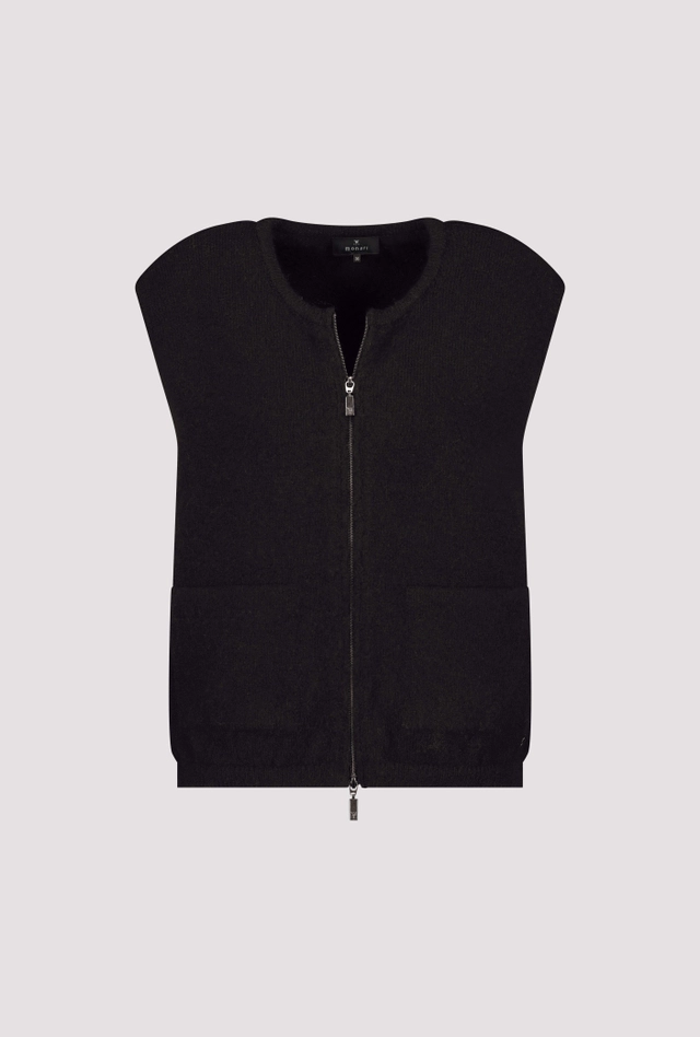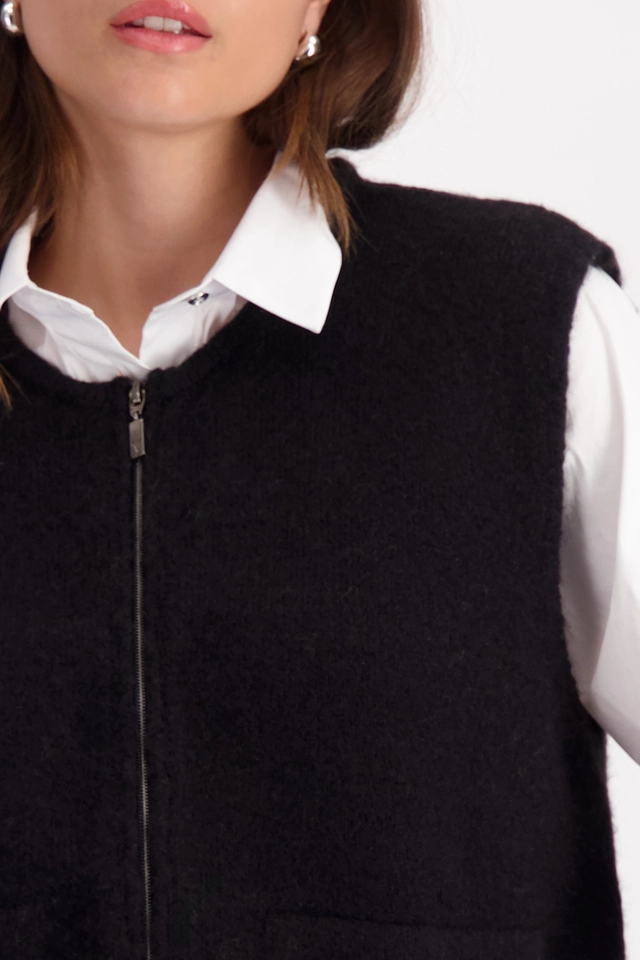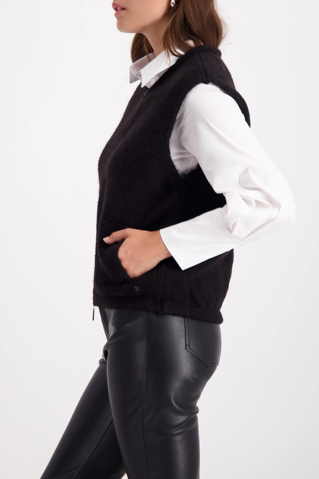 Dit vest van het merk Monari is gemaakt van:Materiaal 1: 61% polyacryl;Materiaal 2: 26% wol;Materiaal 3: 11% polyamide;Materiaal 4: 2% elastaan.