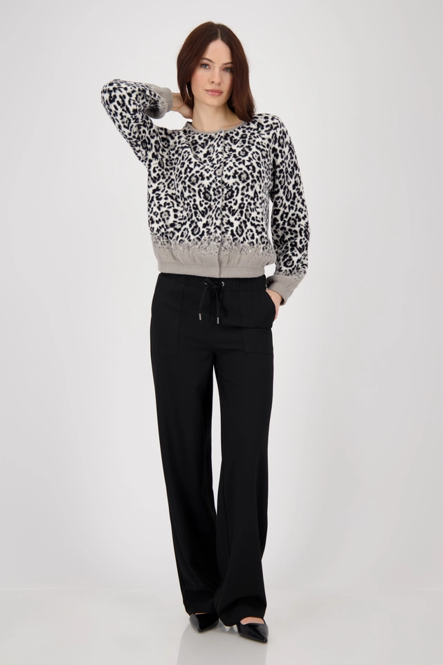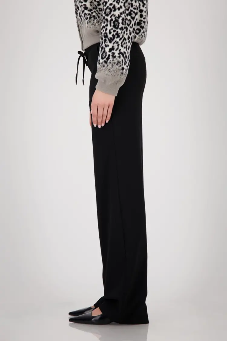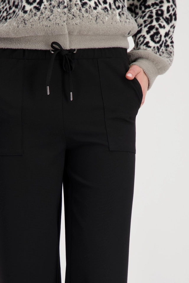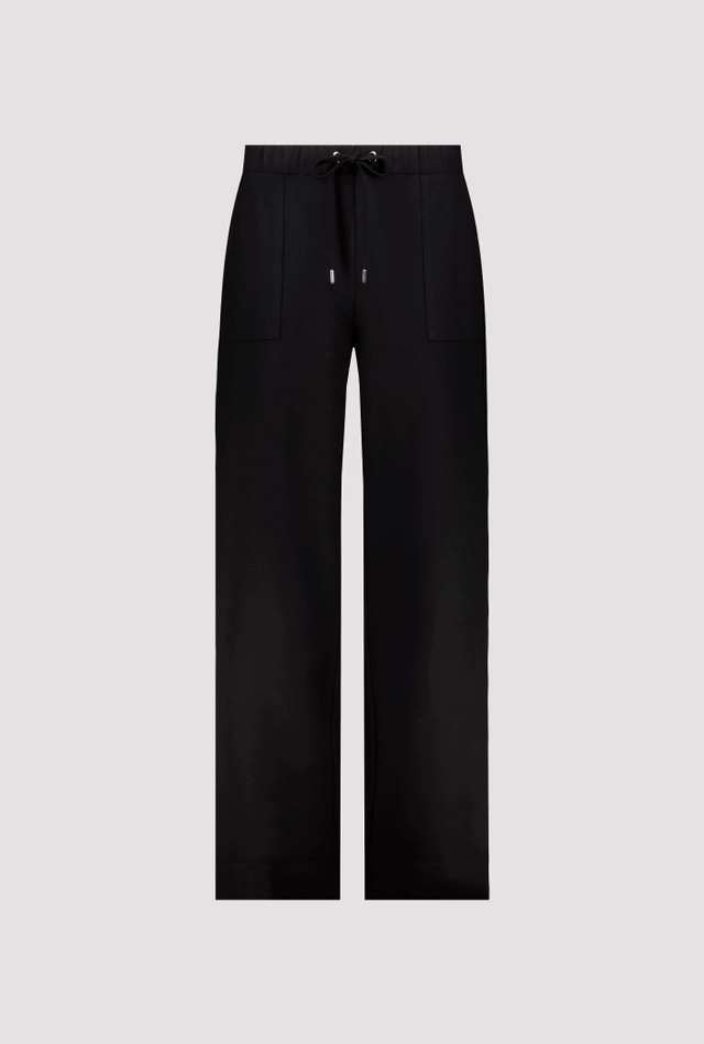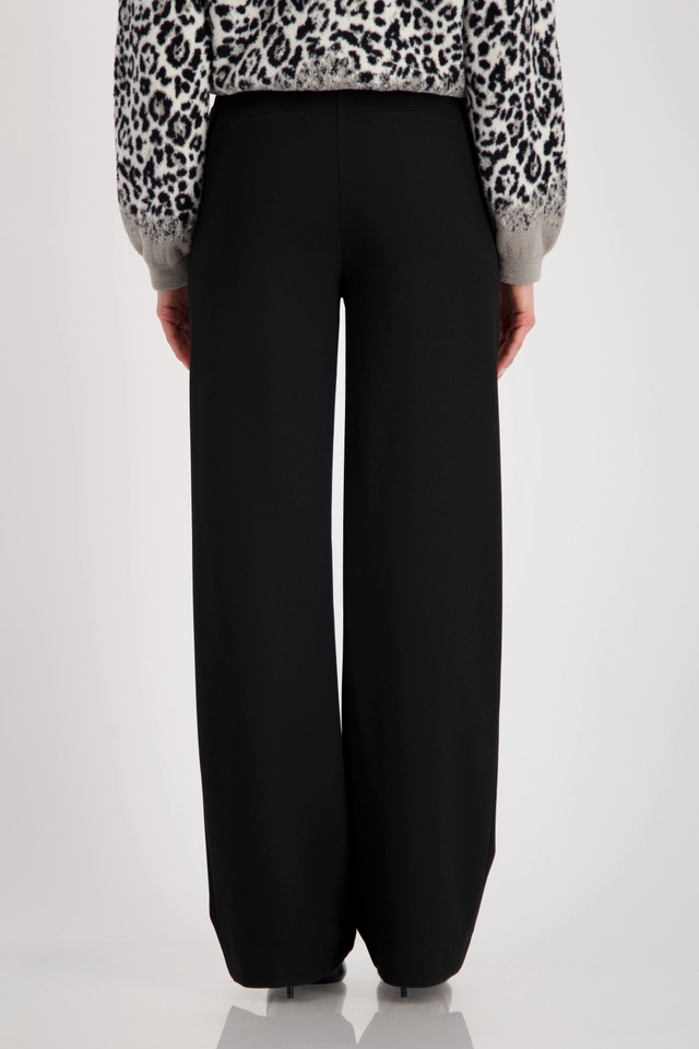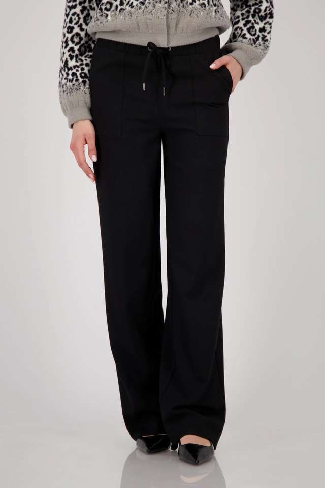 Deze broek van het merk Monari is gemaakt van:Materiaal 1: 61% polyester;Materiaal 2: 35% viscose;Materiaal 3: 4% elastane.