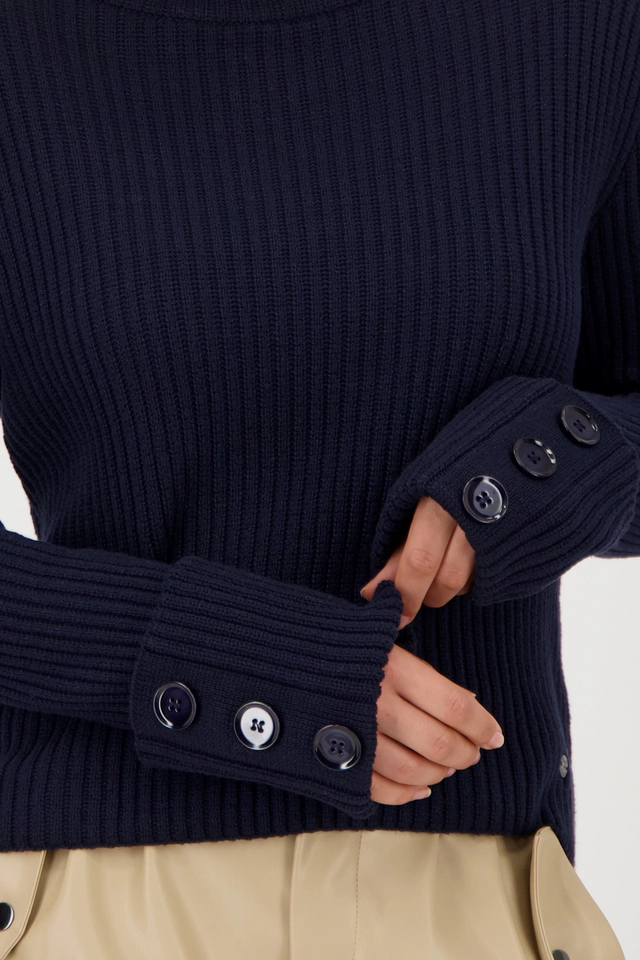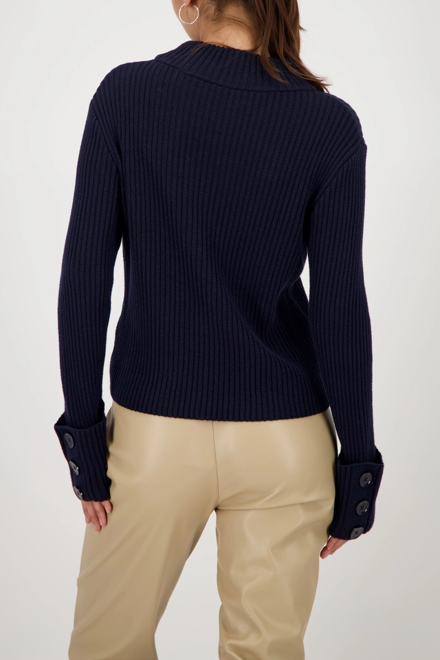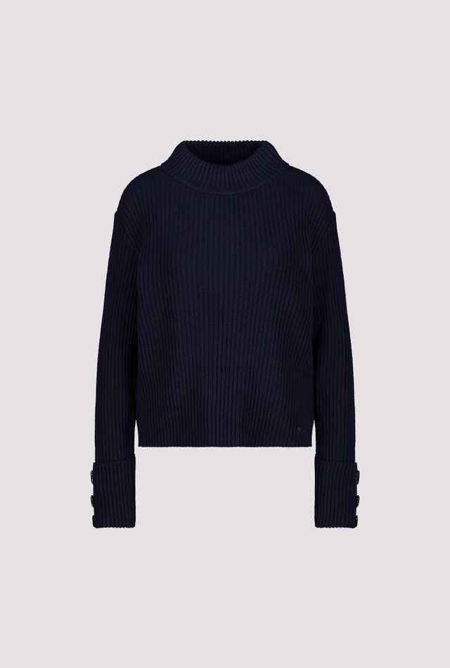 • Elegante gebreide trui van het merk Monari, gemaakt van een hoogwaardig katoenmengsel, met ribstructuur, opstaande kraag en brede mouwen met knopen voor stijlvolle accenten.