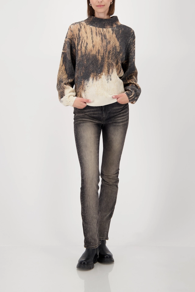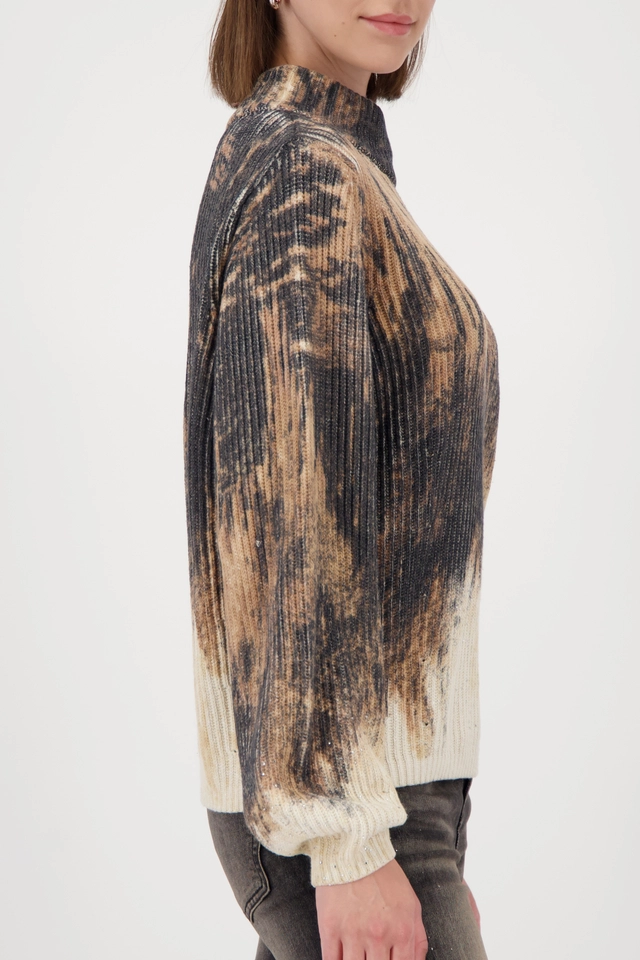 Deze trui van het merk Monari is gemaakt van:Materiaal 1: 56% katoen;Materiaal 2: 37% polyacryl;Materiaal 3: 7% gemetalliseerd polyester.