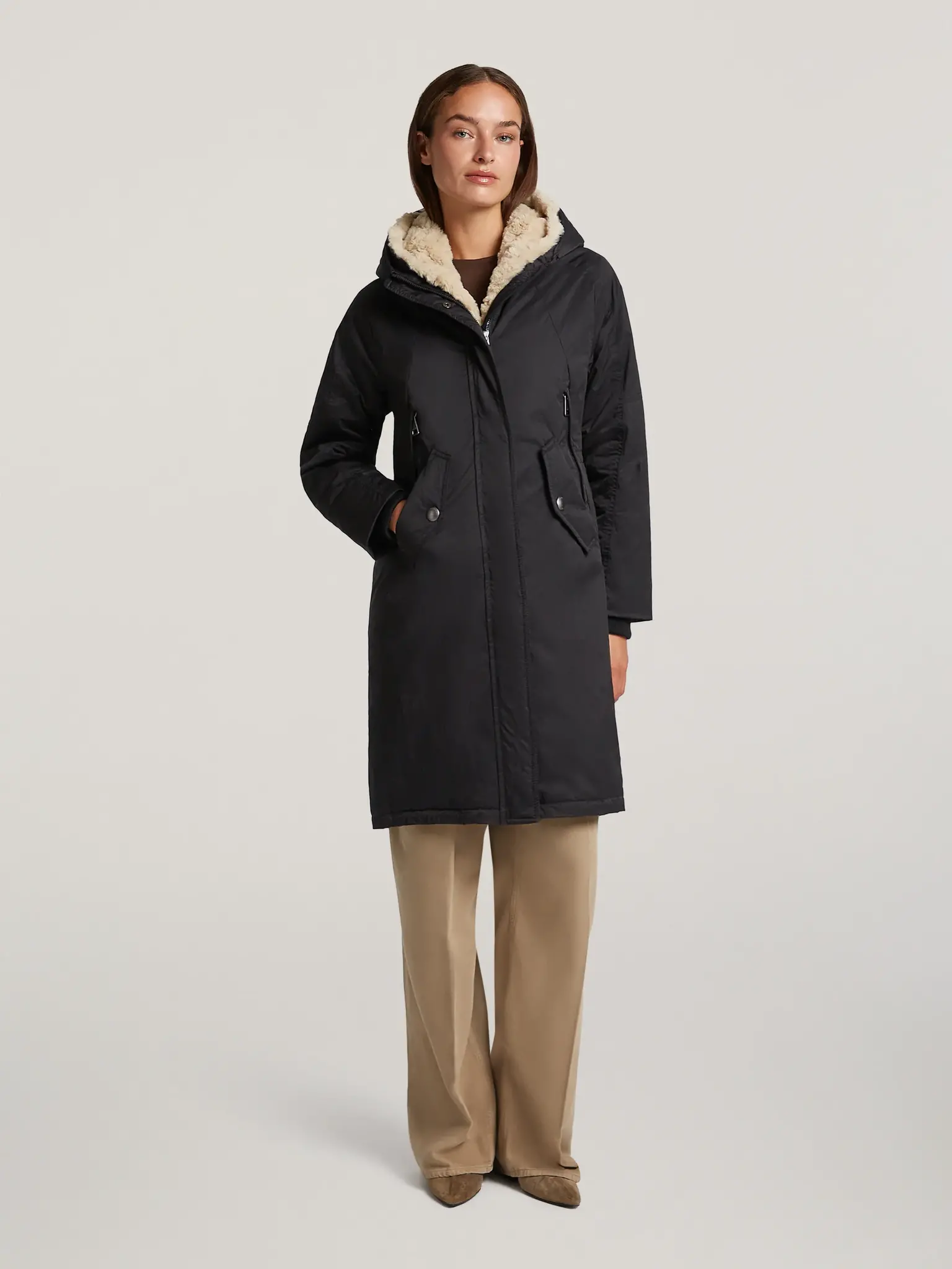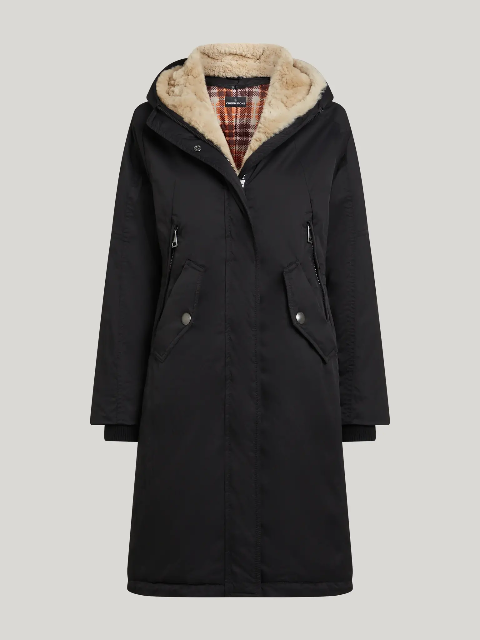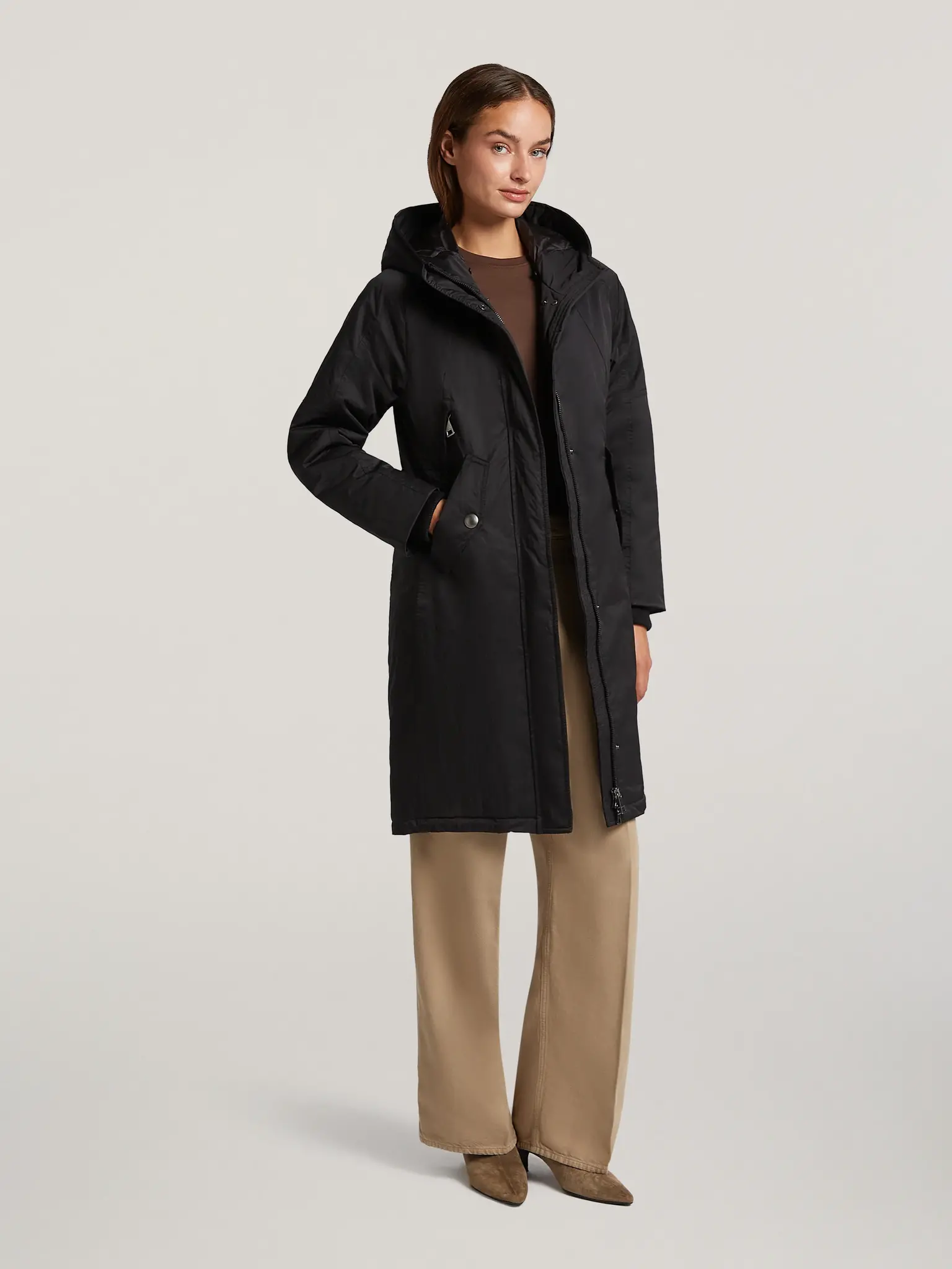 • Deze parka combineert een luxe uitstraling met een praktisch ontwerp. Gemaakt van zacht satin crush-materiaal en voorzien van een afneembare imitatiebont voering in de capuchon en voorzijde, perfect om aan te passen aan verschillende seizoenen en stijlen.