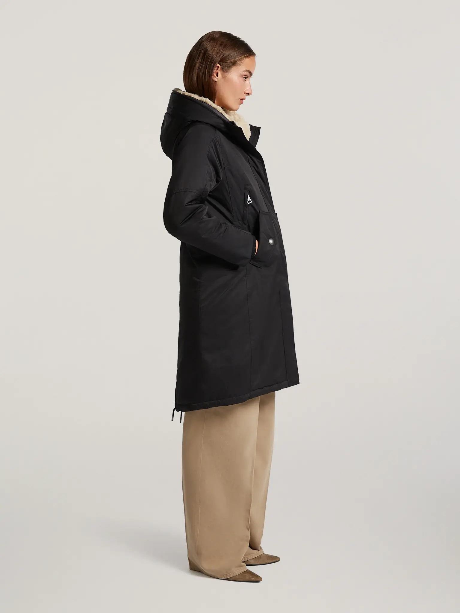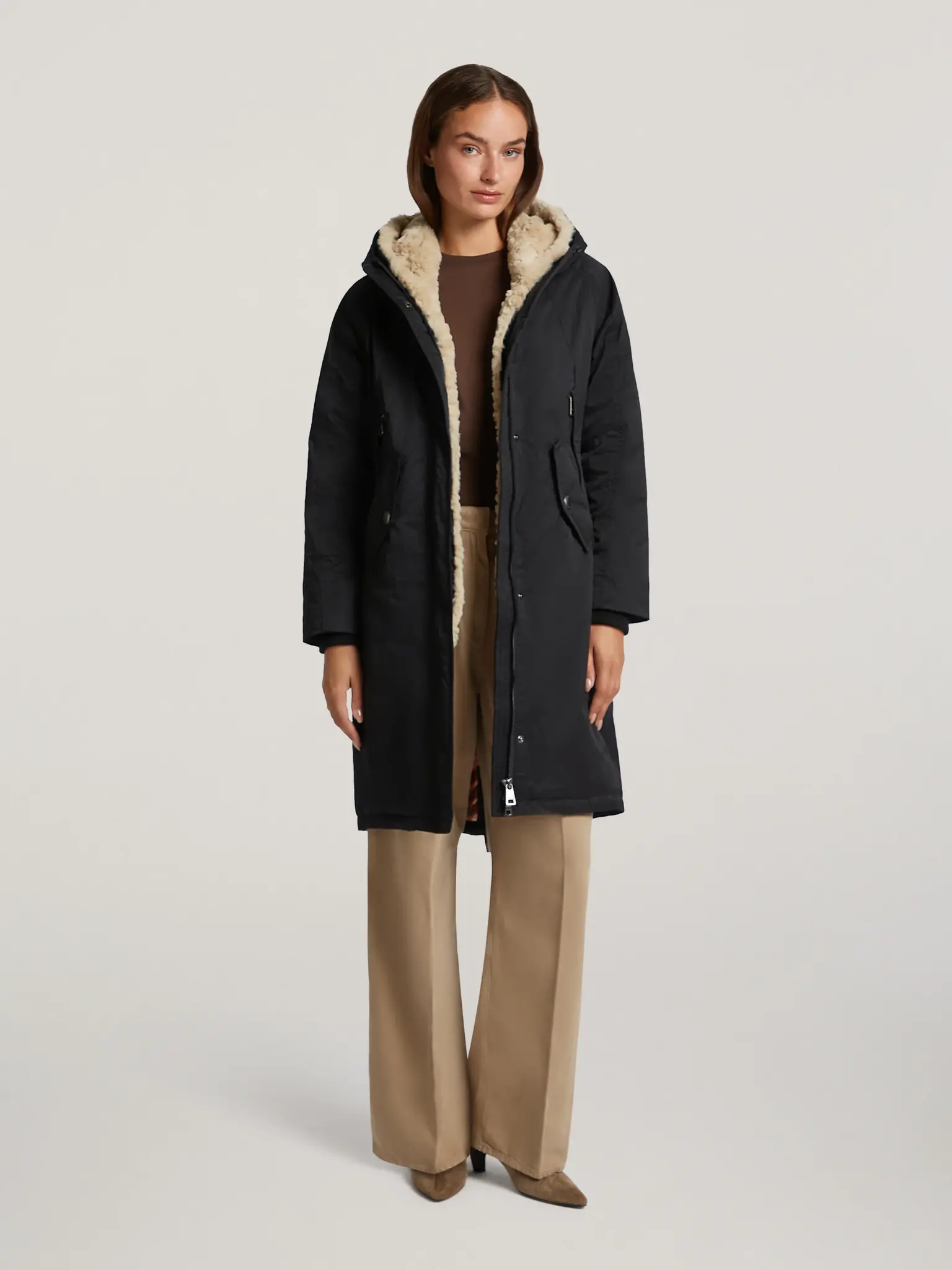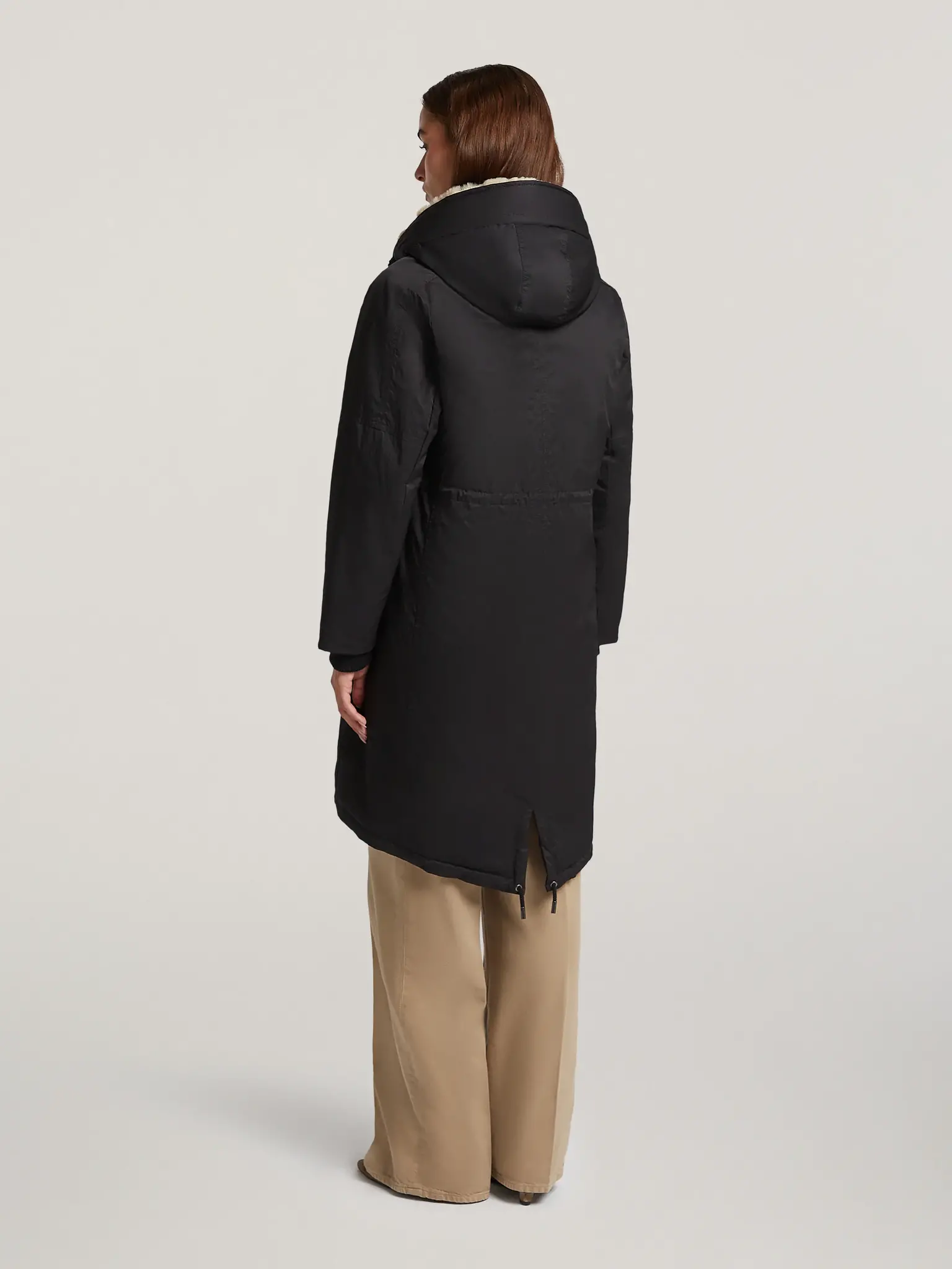 • Deze parka combineert een luxe uitstraling met een praktisch ontwerp. Gemaakt van zacht satin crush-materiaal en voorzien van een afneembare imitatiebont voering in de capuchon en voorzijde, perfect om aan te passen aan verschillende seizoenen en stijlen.