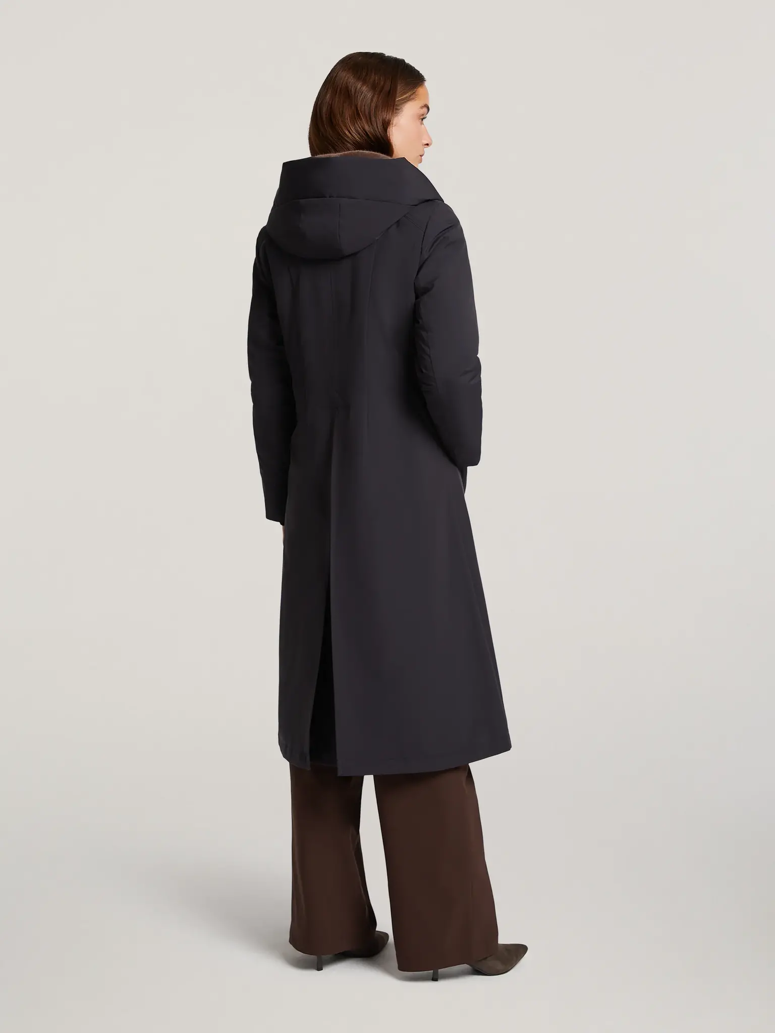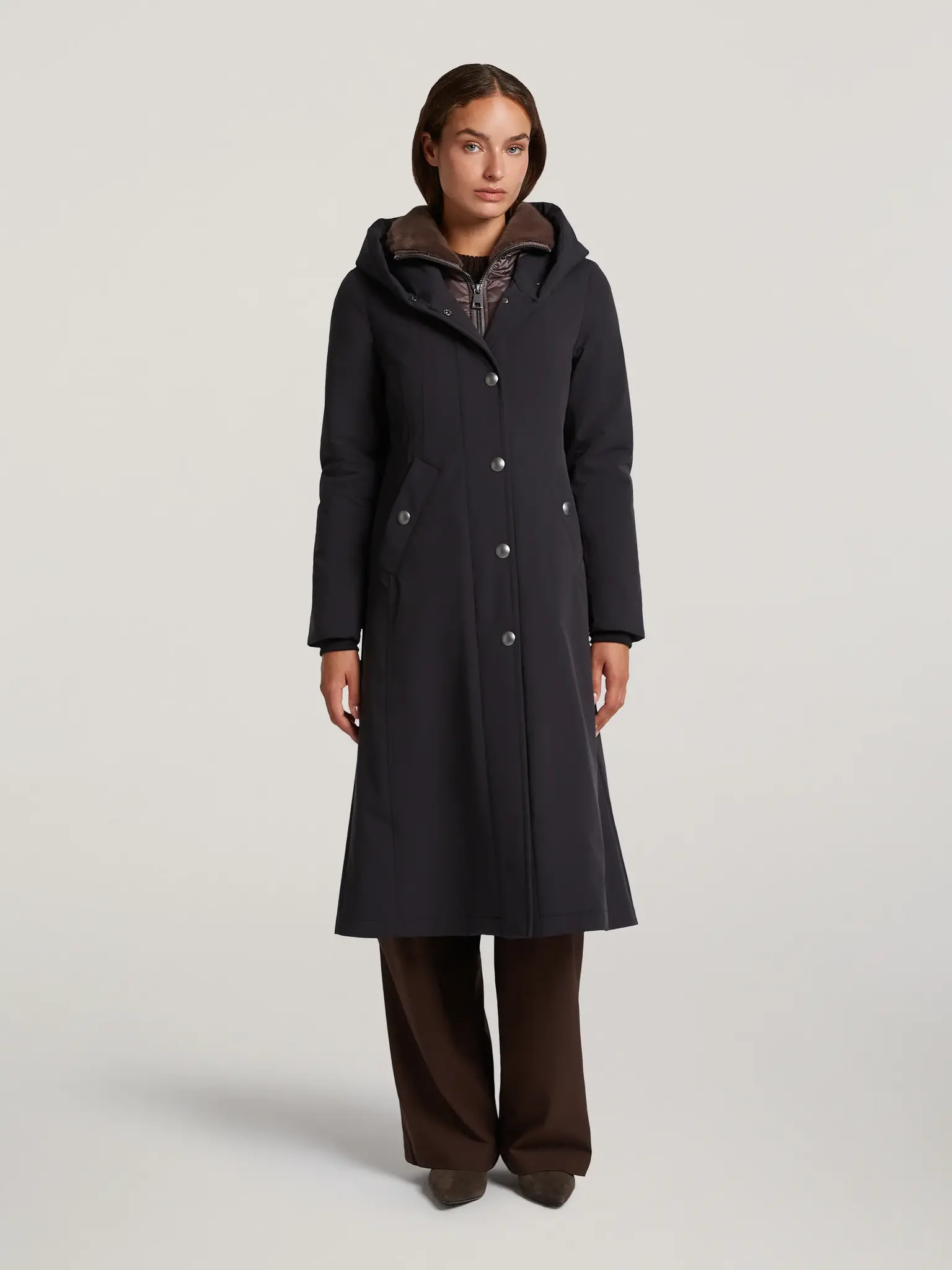 De sjaalkraag met capuchon en de afneembare gewatteerde binnenpanelen met zachte imitatiebontkraag maken deze jas van het merk Creenstone geschikt voor verschillende seizoenen en gelegenheden. De sierlijke plooi aan de achterkant zorgt voor een vrouwelijke en verfijnde pasvorm. Een stijlvolle allrounder die comfort, elegantie en bescherming bied voor elk weertype.