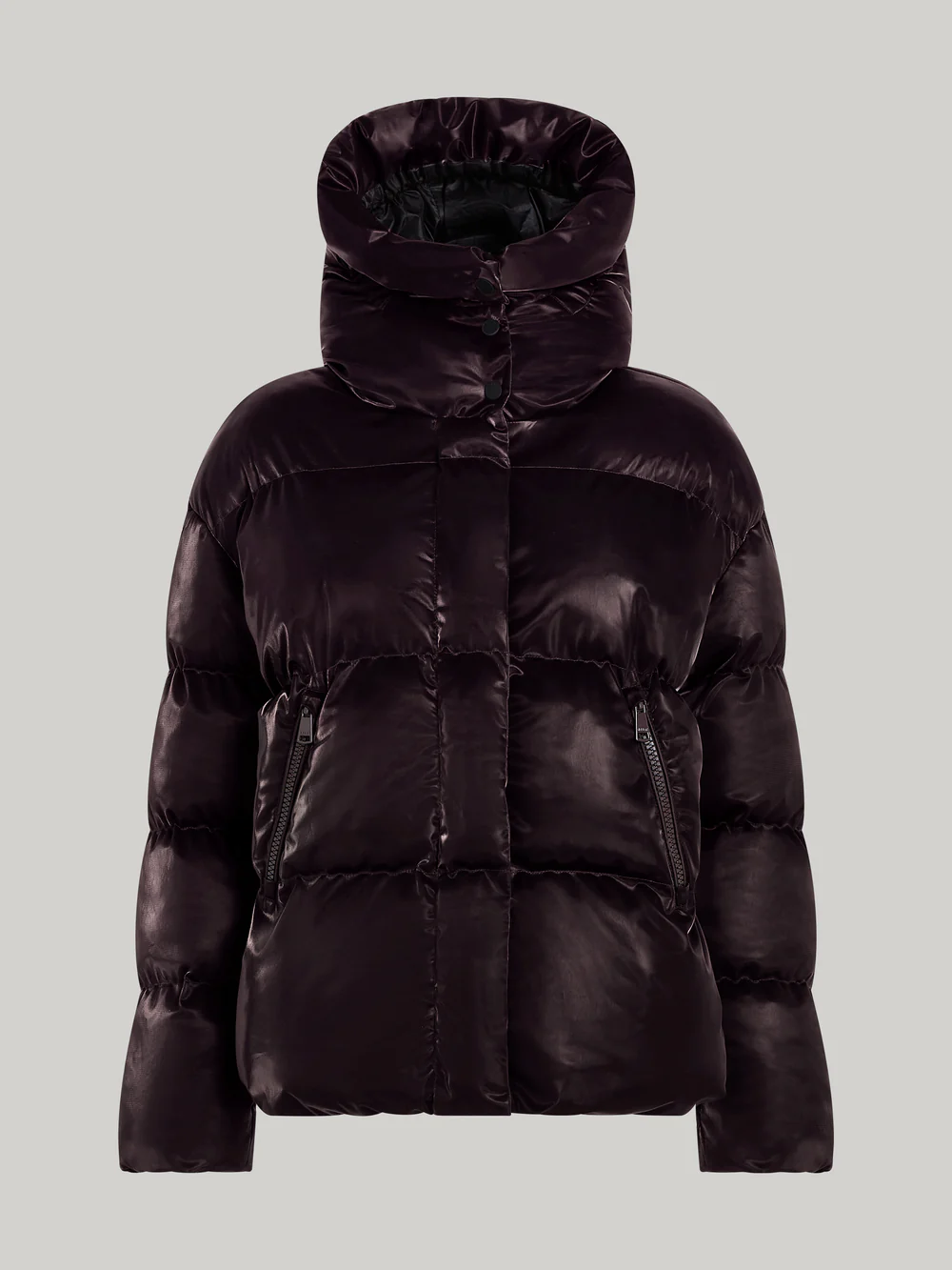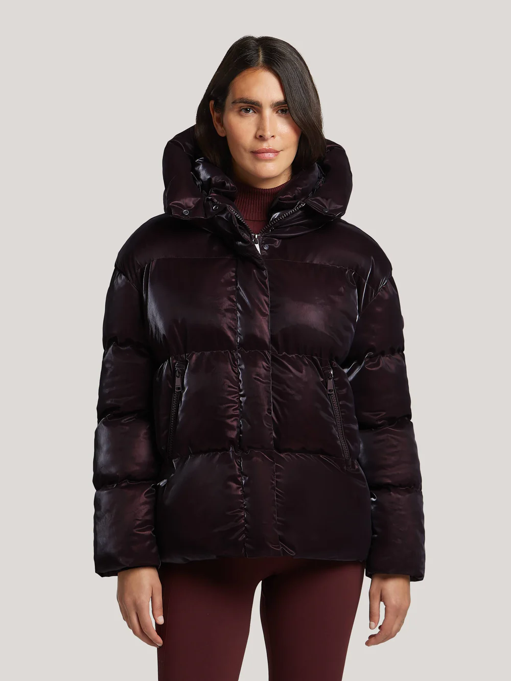 • Korte puffer Airi van het merk Reset en is gemaakt van een glanzende stof. De ondergrond van de stof is gemaakt van gebreid materiaal wat voor elasticiteit zorgt en op het oppervlak zit een speciale laag die een uniek glanzend twee kleurig effect geeft.