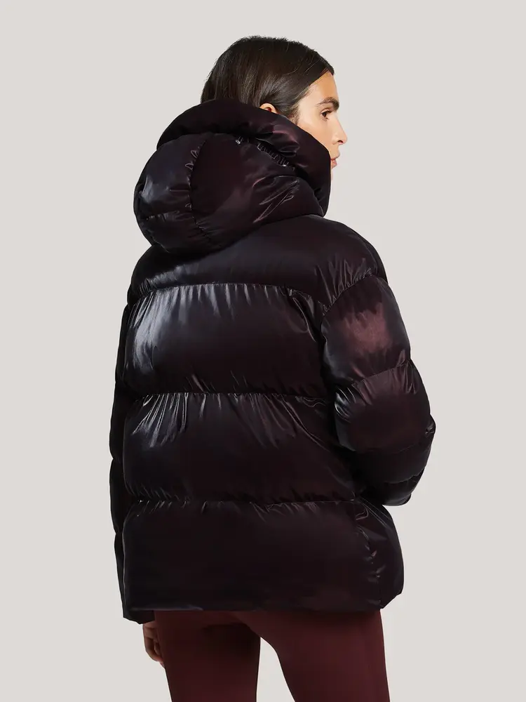 • Korte puffer Airi van het merk Reset en is gemaakt van een glanzende stof. De ondergrond van de stof is gemaakt van gebreid materiaal wat voor elasticiteit zorgt en op het oppervlak zit een speciale laag die een uniek glanzend twee kleurig effect geeft.